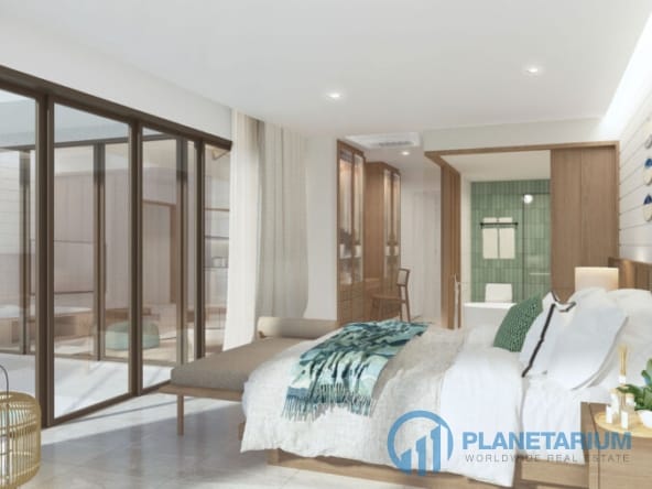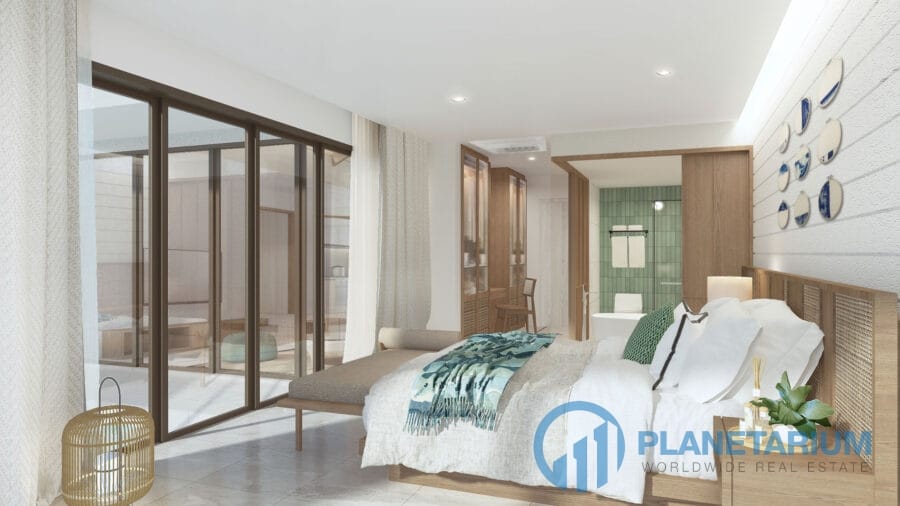 - Chambre principale : Accès direct à la piscine, salle de bains privative avec baignoire