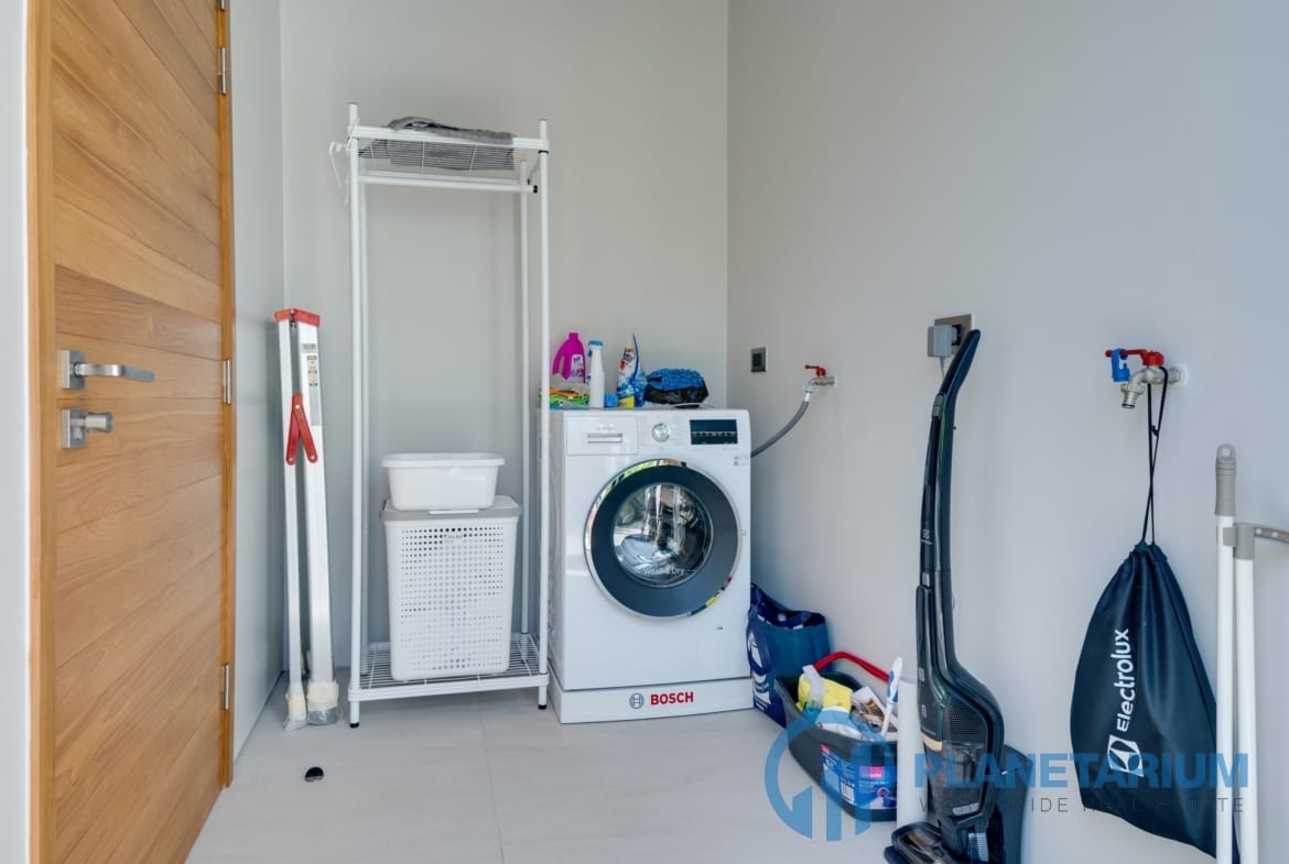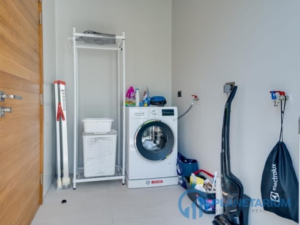 L’Ăźlot de cuisine offre une vue sur le hall, le salon et la zone piscine. Adjacent Ă la cuisine, vous trouverez une buanderie Ă©quipĂ©e d’un lave-linge.