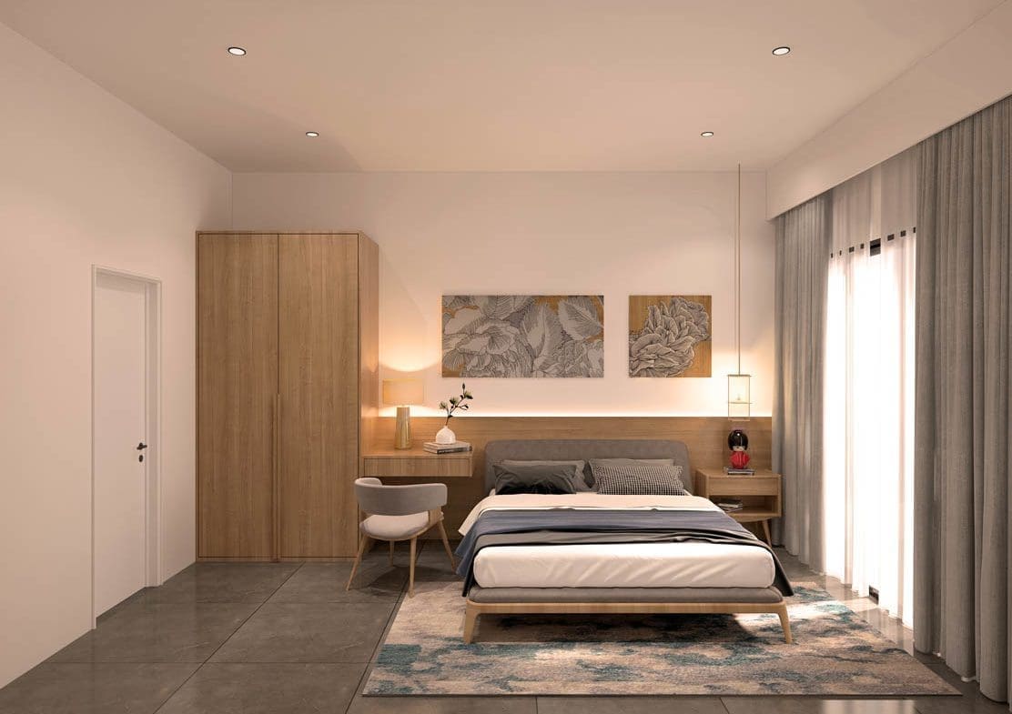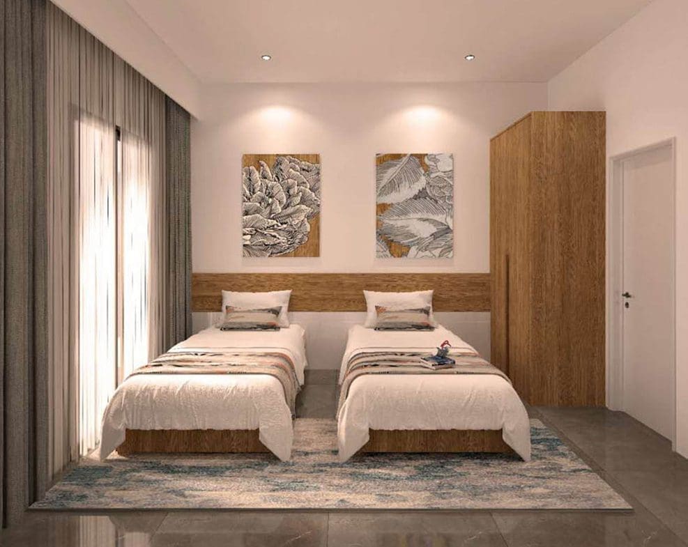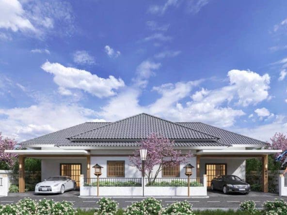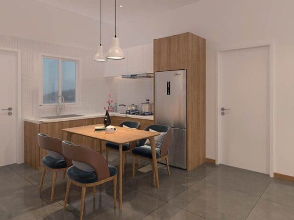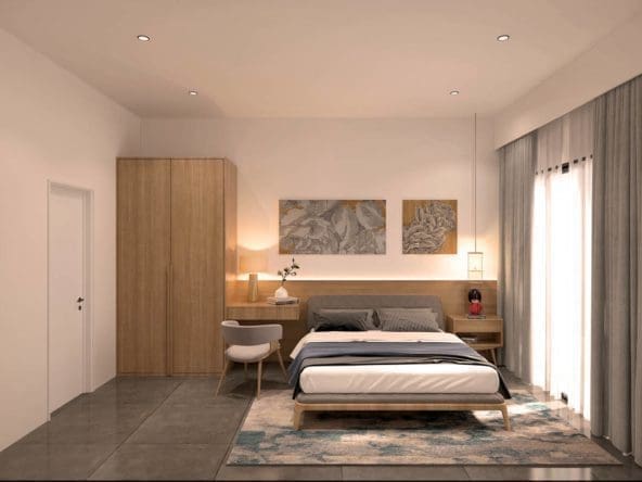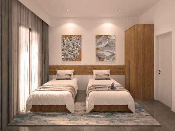 La villa de 94 m2 comprend deux chambres à coucher reliées par des toilettes communes, un salon spacieux, une cuisine et une autre chambre à coucher, ainsi qu’un petit jardin privé.