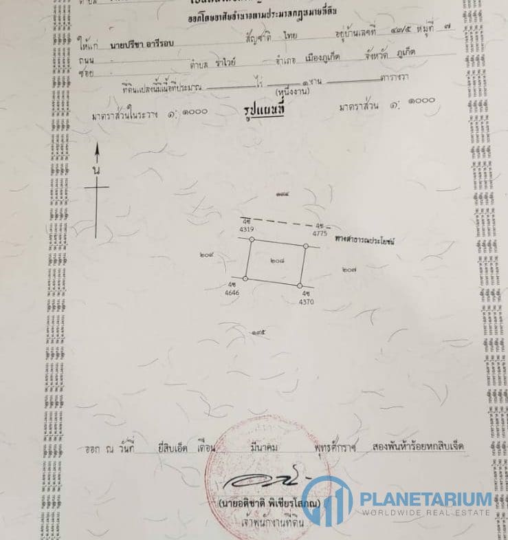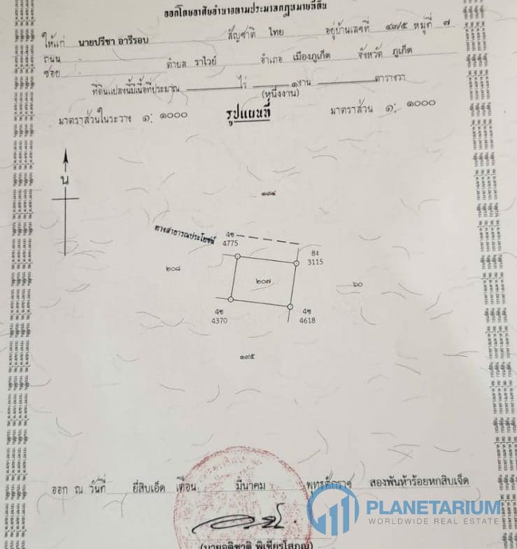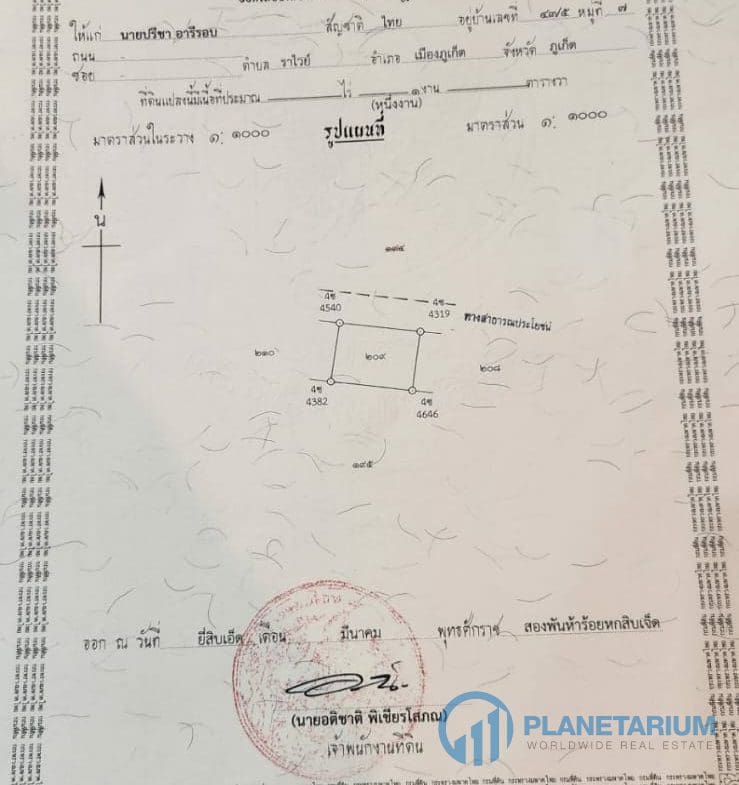 Ainsi, la superficie totale du terrain à vendre est de 1 rai, divisée en quatre titres de propriété, chaque titre de propriété couvrant 100 mètres carrés. Le prix de vente pour chaque titre de propriété est de 6 200 000 bahts.