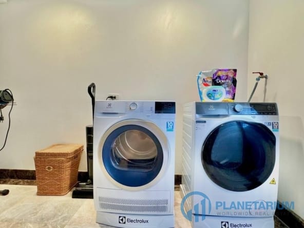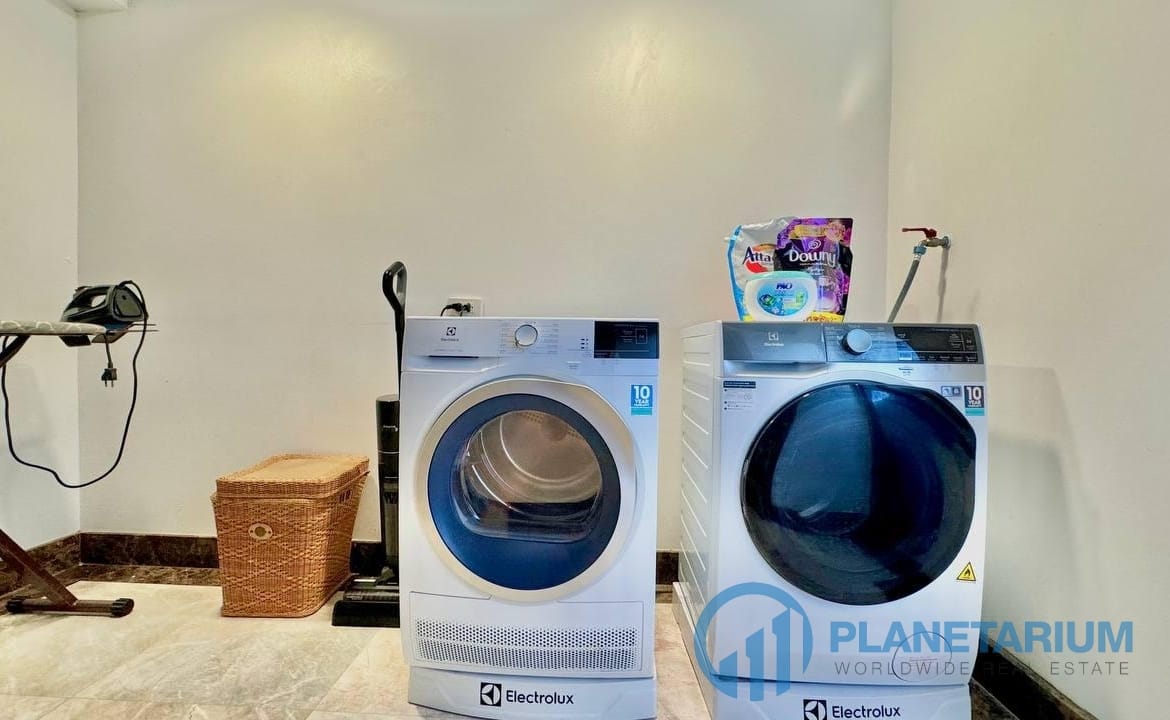 Équipée de machines à laver et à sécher (Electrolux), planche à repasser, fer à repasser