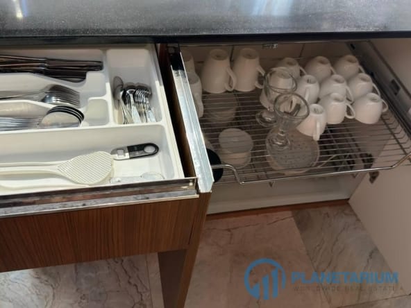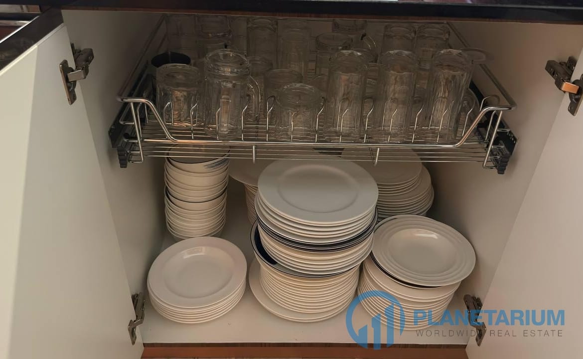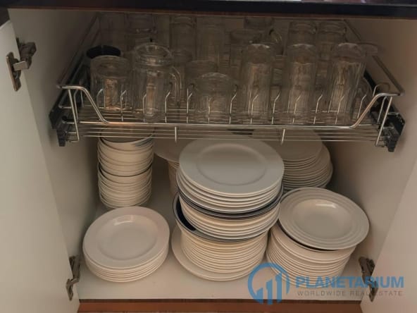 Rangement organisé pour les produits de nettoyage, la vaisselle et les équipements de cuisine