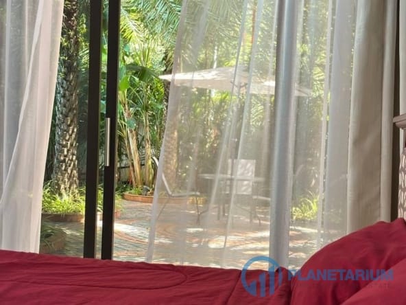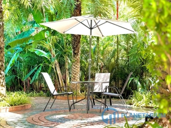 🌿 Entourée de verdure – aménagée avec des palmiers (4 espèces, 5-15 m de haut) formant une clôture verte naturelle + système d’arrosage automatique