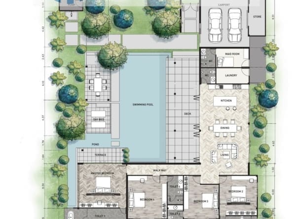 Un design moderne ancré dans des détails tropicaux thaïlandais. Villa parfaite pour ceux qui recherchent une vie de qualité dans un environnement confortable. Raffinée, élégante et conçue de manière intuitive, la piscine centrale et spacieuse permet à toutes les habitations de bénéficier du double aspect de la lumière naturelle et de l’air pénétrant des deux côtés.