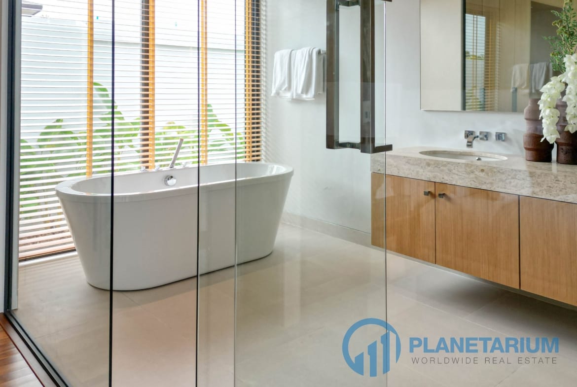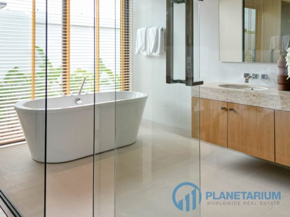 Chambre principale avec double vasques, une baignoire et douche séparées, et un accès direct à la terrasse de la piscine.
