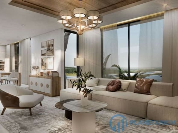 Vous pénétrez dans des salons et des salles à manger spacieux, ornés de meubles de luxe, qui créent une ambiance raffinée.