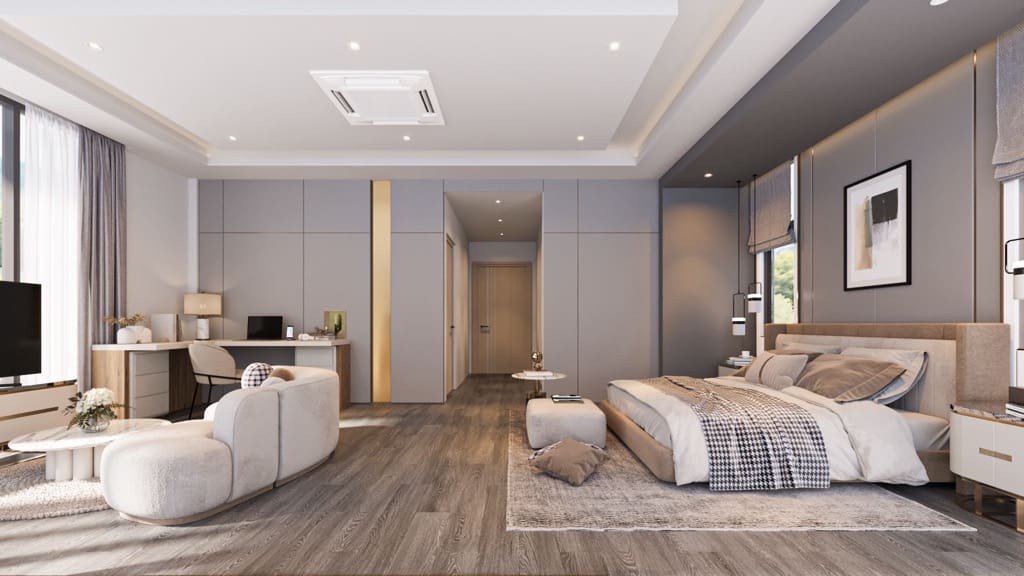 - La chambre principale, d’un luxe inégalé, comprend un espace de vie privé et une salle de bains avec baignoire et douche séparées.