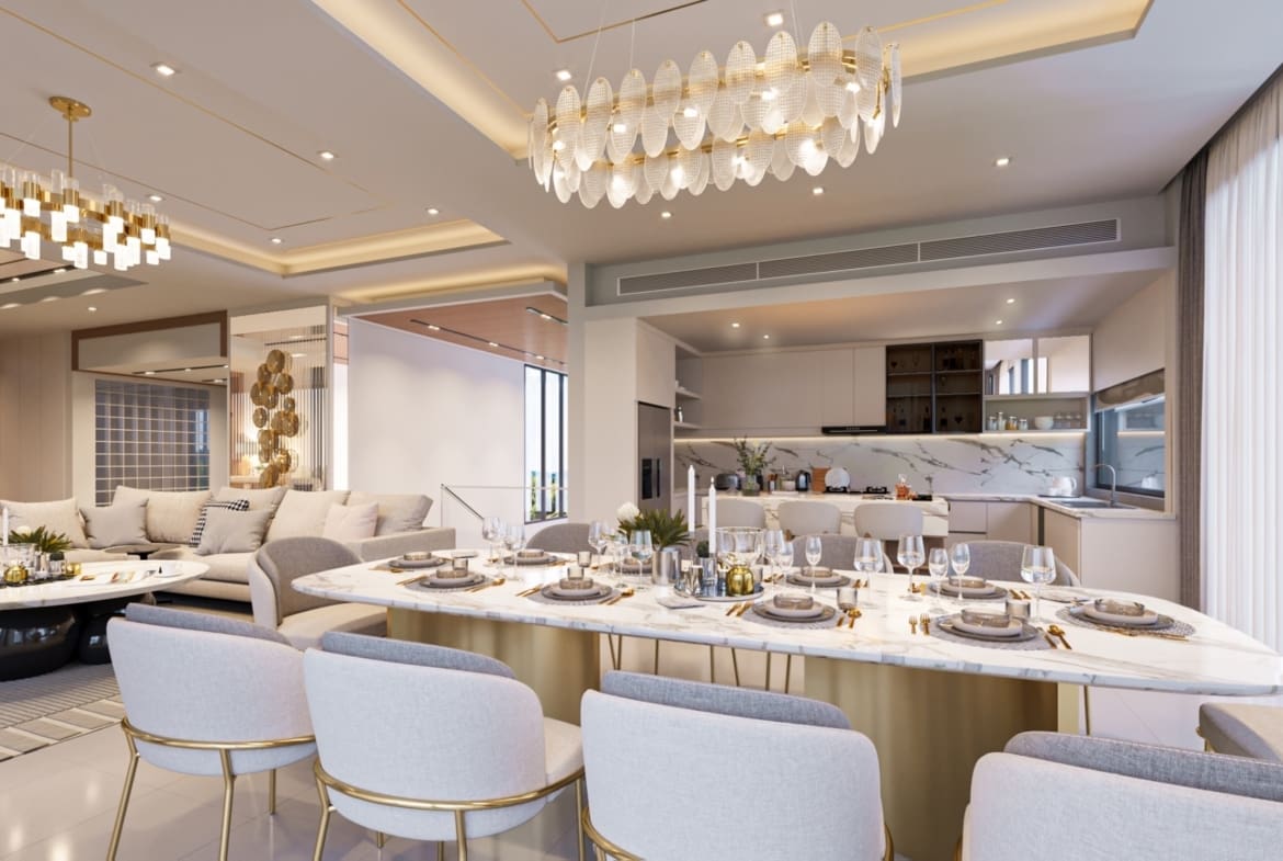 - Le salon et la salle à manger, magnifiquement conçus, sont ouverts et dotés d’une cuisine de style européen.