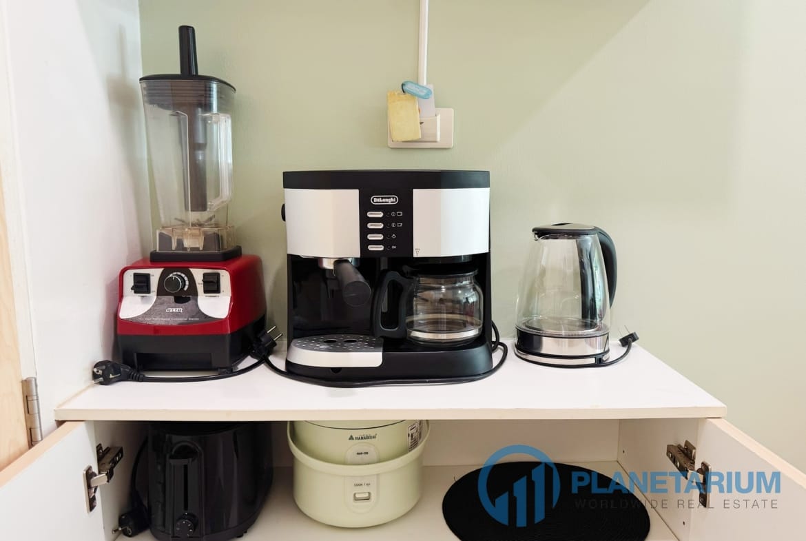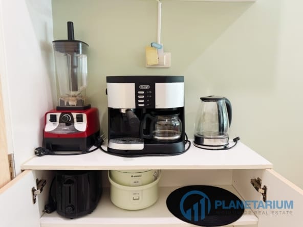 Mikrofalówką, dużą lodówką, urządzeniem do gotowania ryżu, tosterem, blenderem, ekspresem do kawy i kieliszkami do wina 🍷
