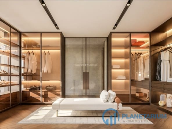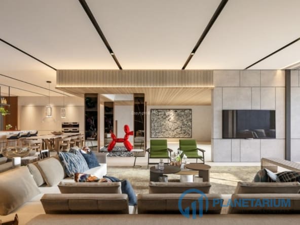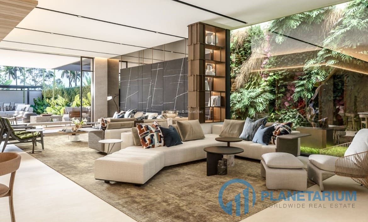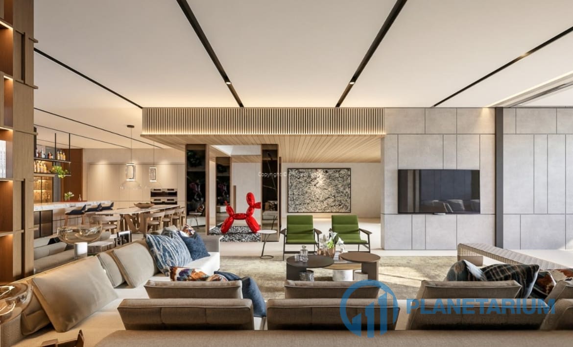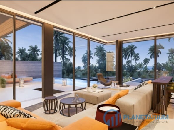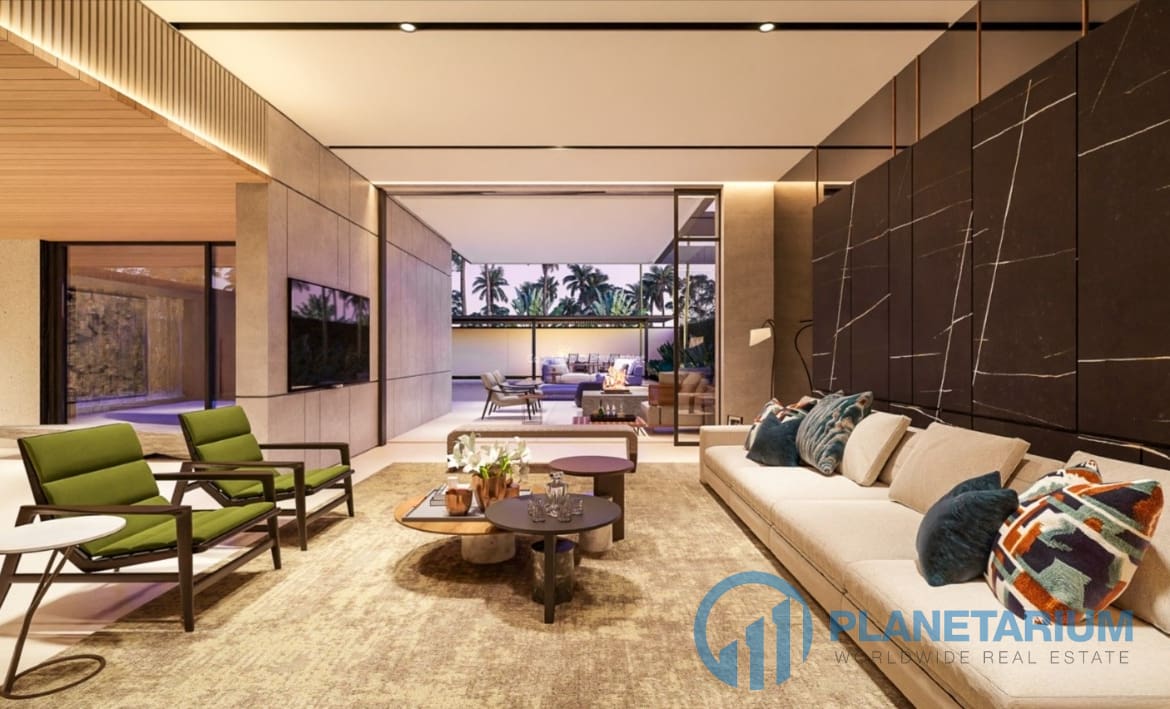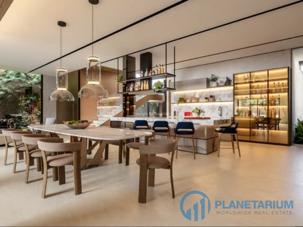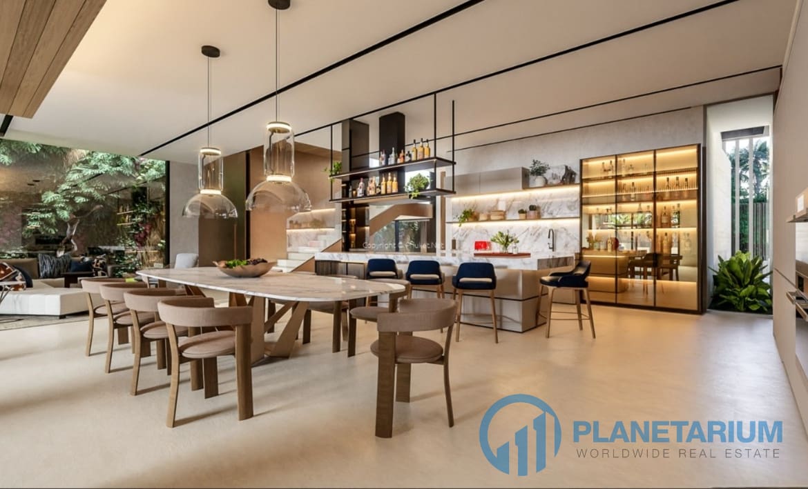 - Parter: Oferuje miejsce parkingowe dla 2 samochodów oraz jasny i przestronny salon i jadalnię na otwartym planie. Obejmuje on dużą europejską kuchnię, salon dla gości z łazienką oraz dodatkową łazienkę dla gości. Salon i jadalnia płynnie otwierają się na piękny zewnętrzny salon i taras, idealny na rodzinne wakacje i spotkania na świeżym powietrzu. Odkryty basen otoczony jest dużym dziedzińcem z leżakami i częścią wewnętrzną z barem przy basenie.