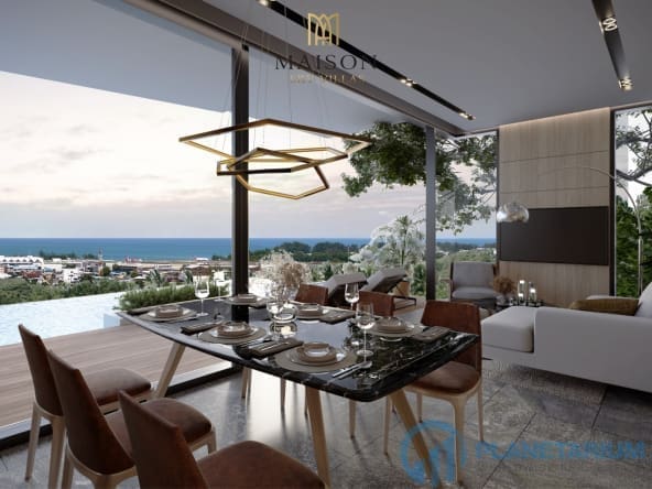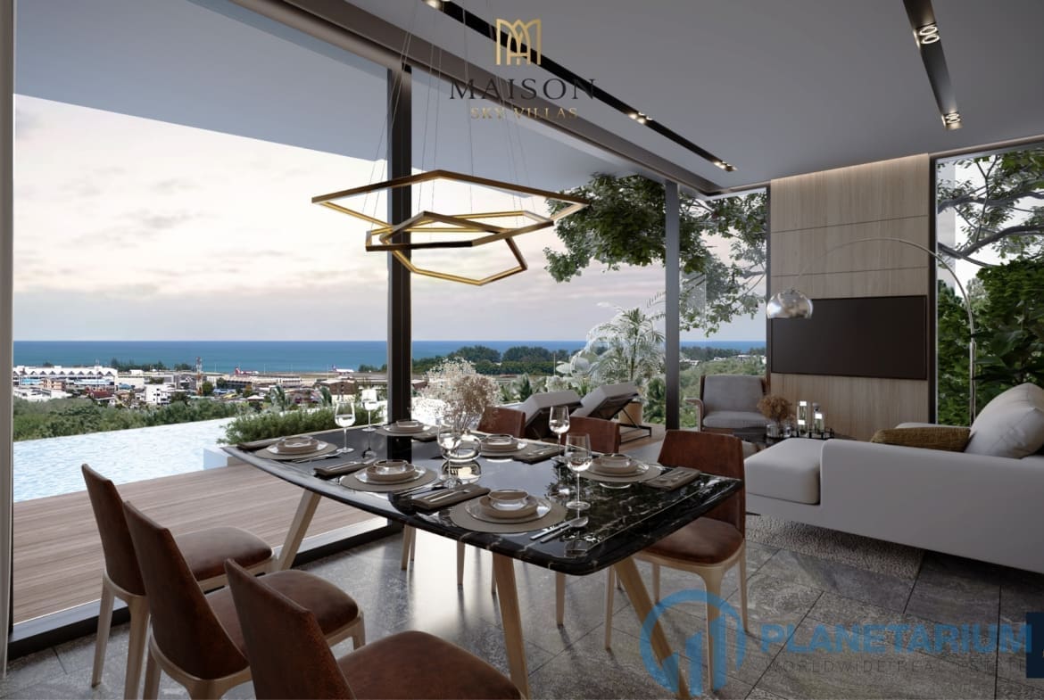 - Salon i jadalnia wychodzą na taras przy basenie z widokiem na spokojną plażę Nai Yang i odległe lotnisko Phuket.