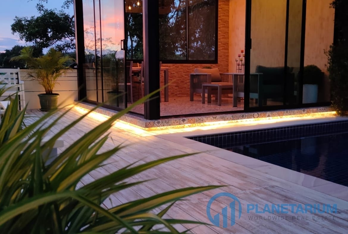 The exterior highlights a beautiful wrap-around terrace and a charming gazebo, perfect for enjoying meals, relaxing, or watching breathtaking sunset views over the mountains 🌄—all while swimming in your private pool.