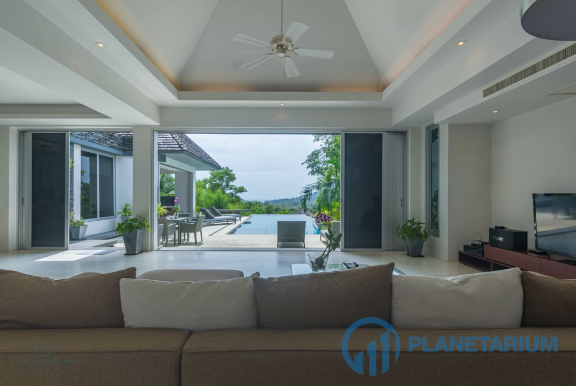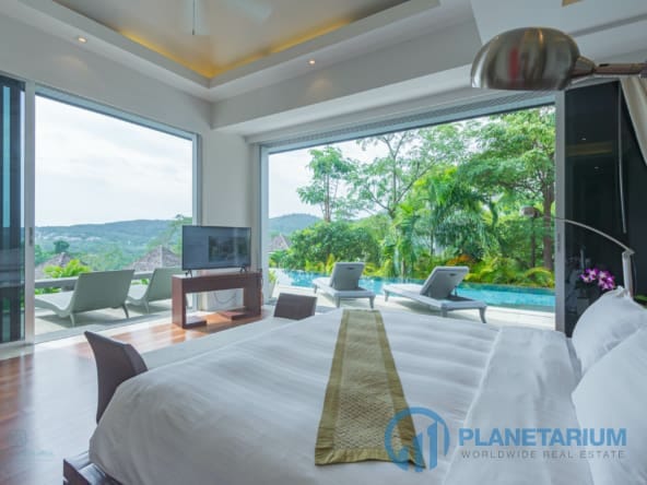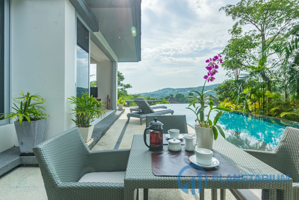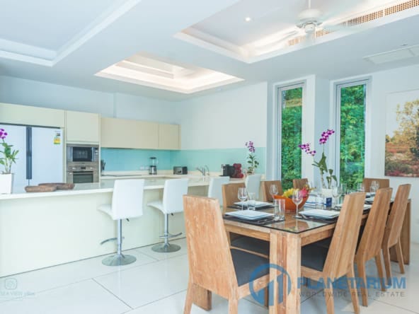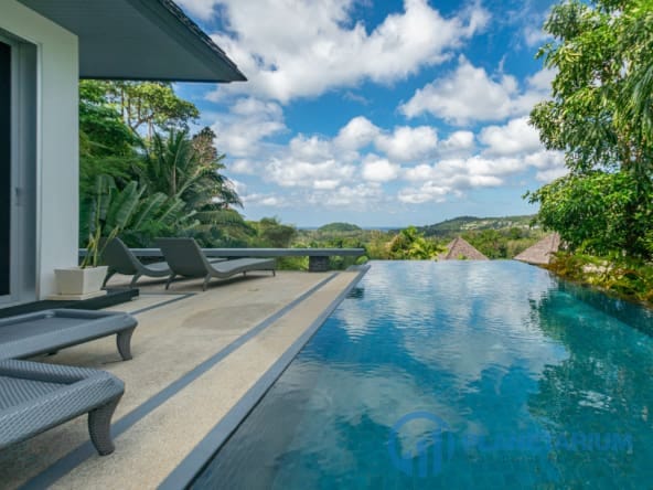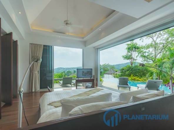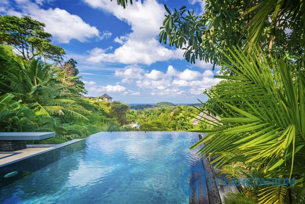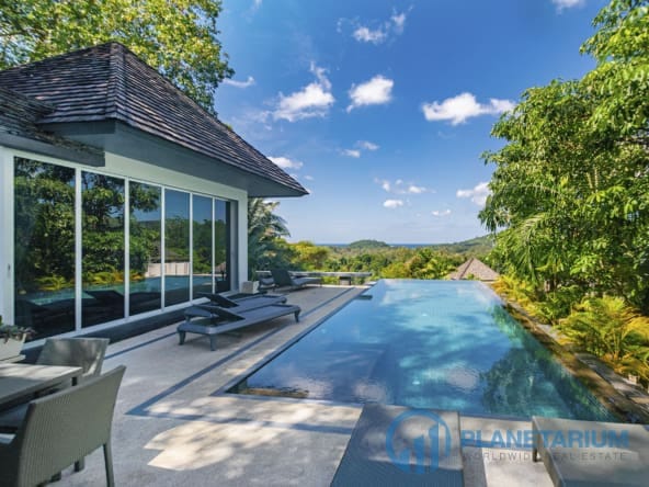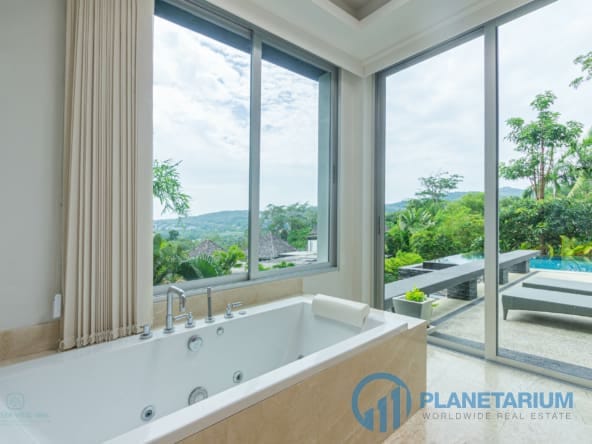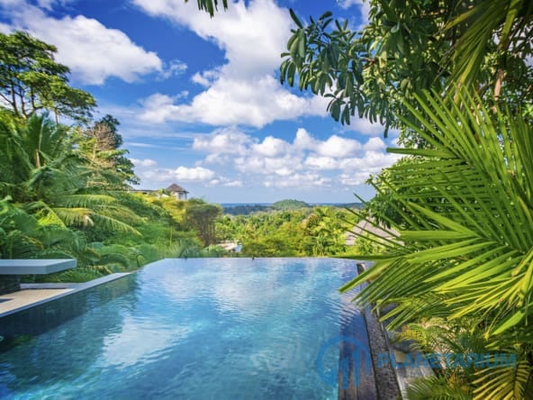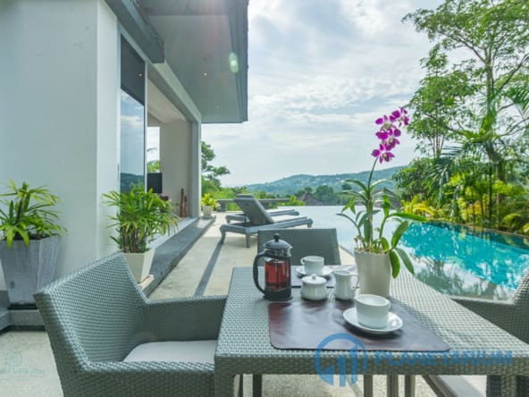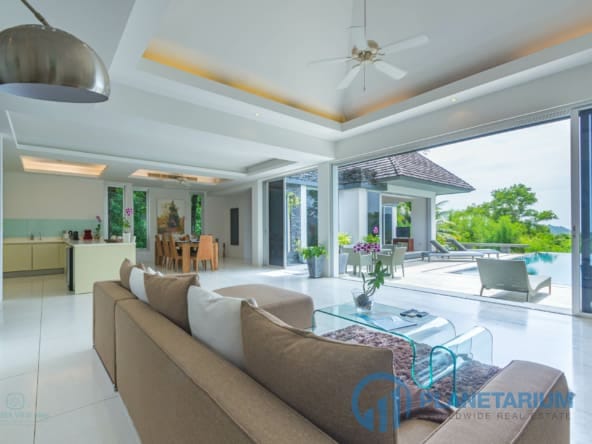 - 🌺 Floor-to-ceiling sliding glass doors in the living room, dining room, and master bedroom open onto a spacious poolside terrace with views of tropical plants, mountains, and the distant Andaman Sea