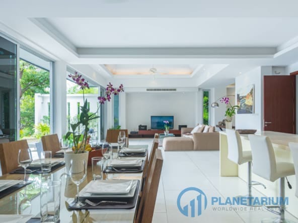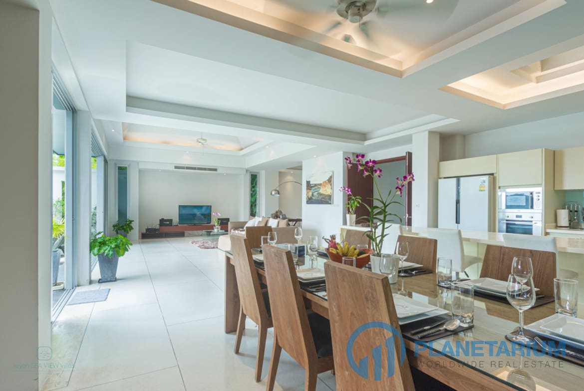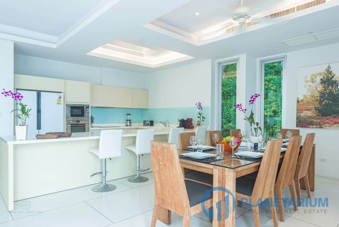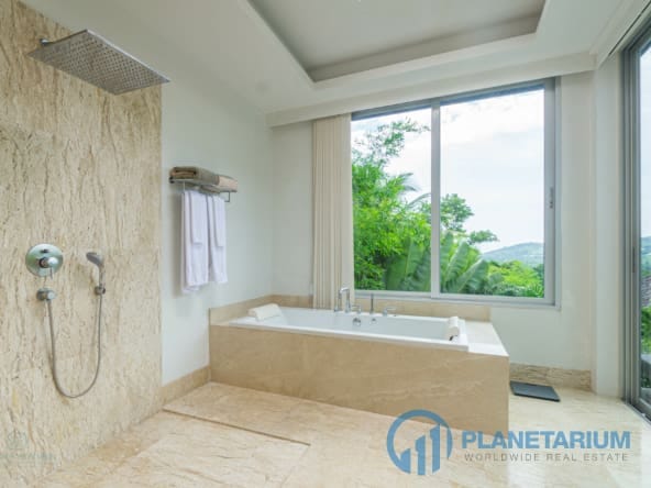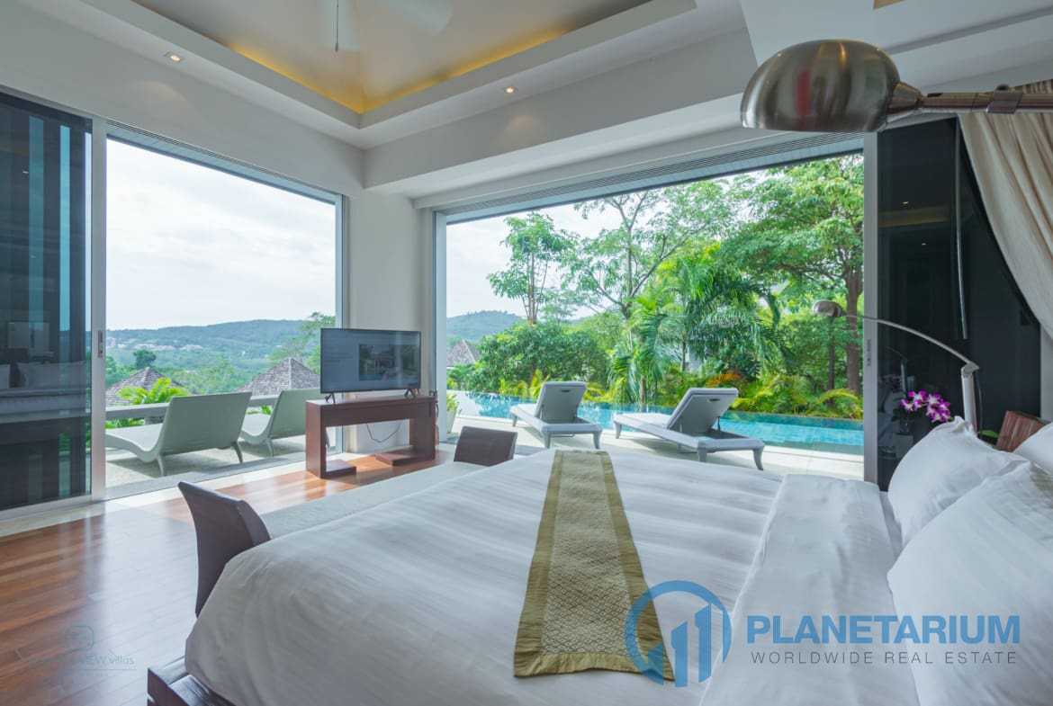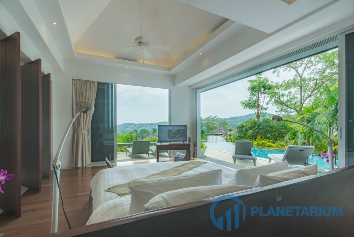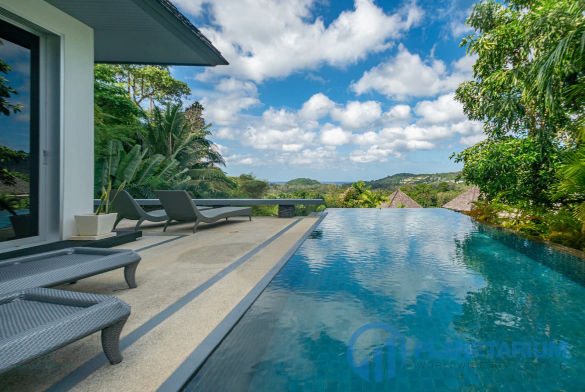 - 🌺 Floor-to-ceiling sliding glass doors in the living room, dining room, and master bedroom open onto a spacious poolside terrace with views of tropical plants, mountains, and the distant Andaman Sea