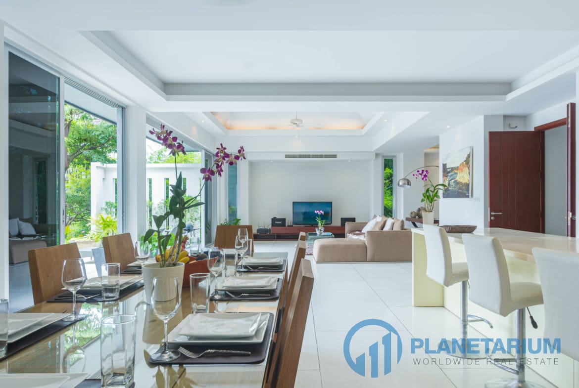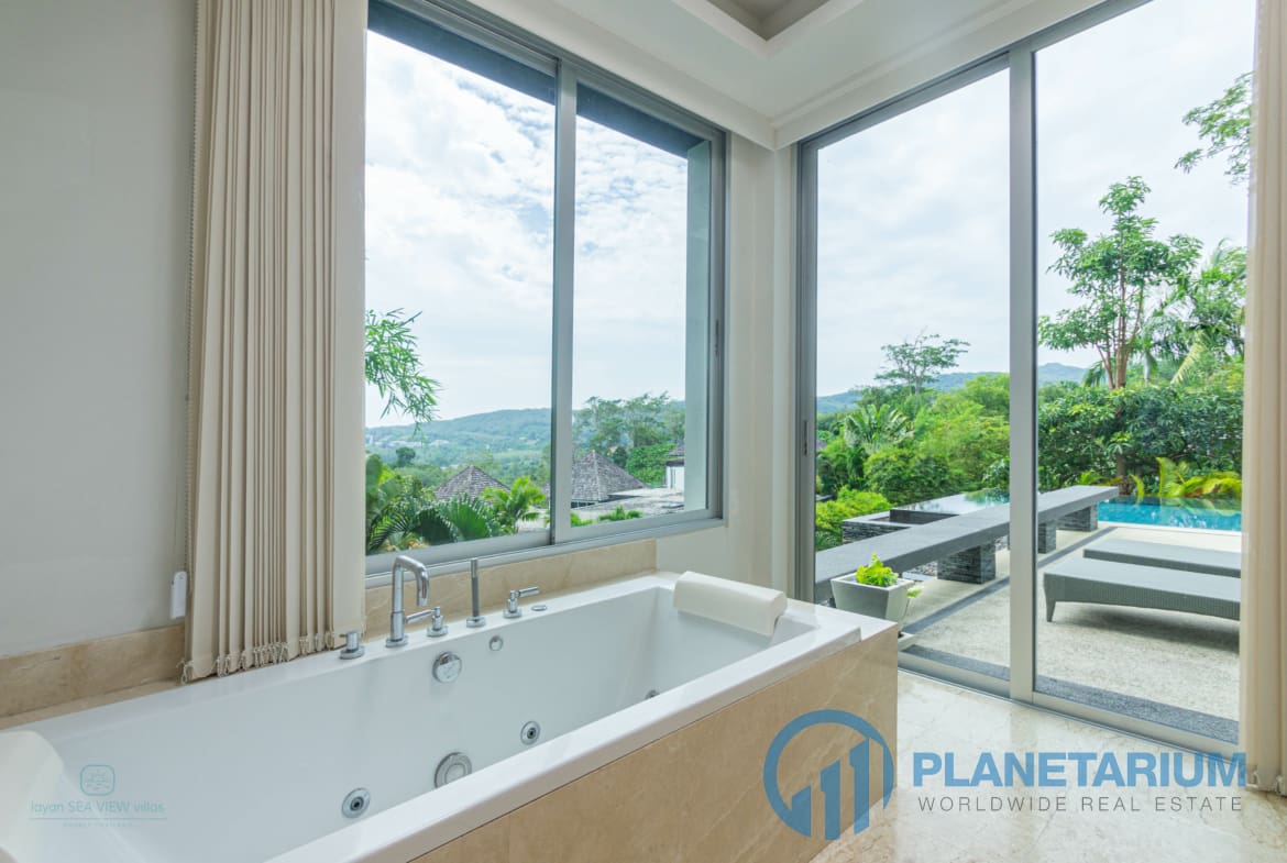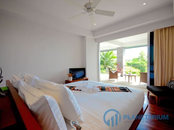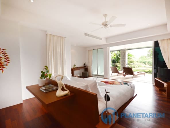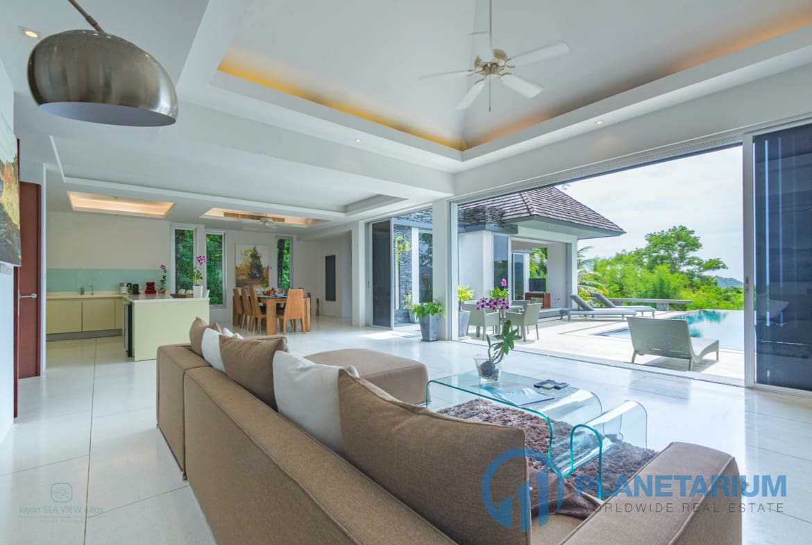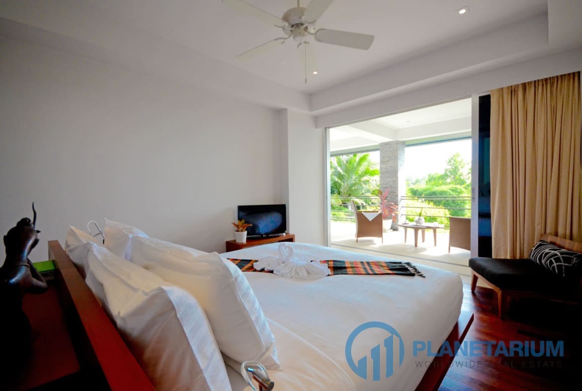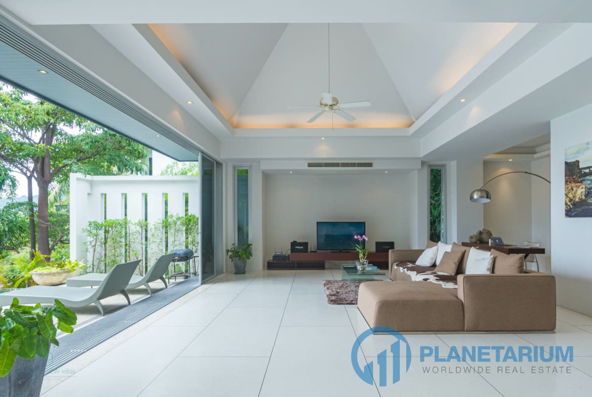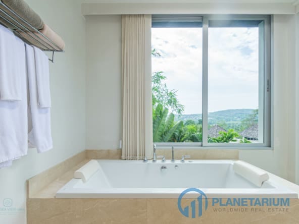 - 🌺 Floor-to-ceiling sliding glass doors in the living room, dining room, and master bedroom open onto a spacious poolside terrace with views of tropical plants, mountains, and the distant Andaman Sea