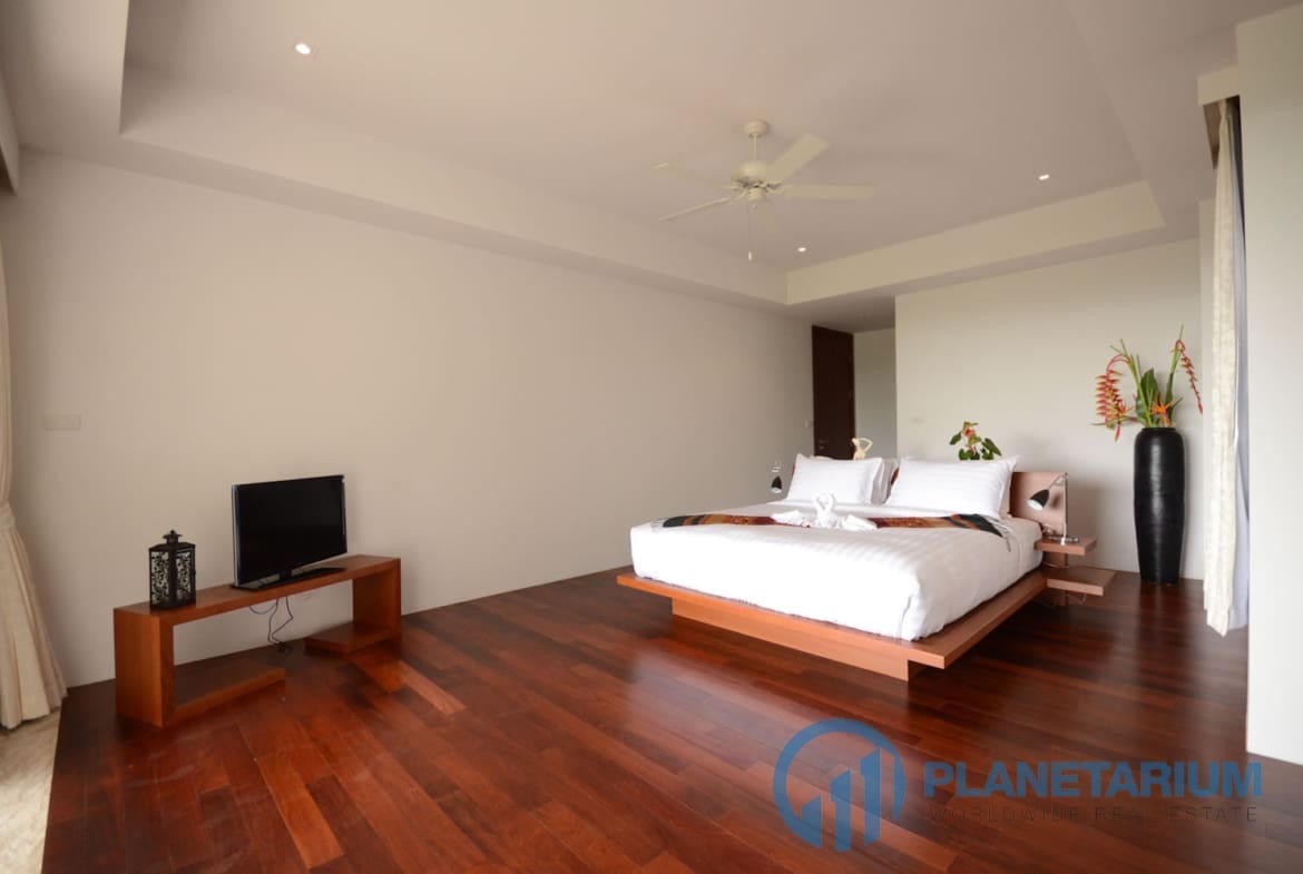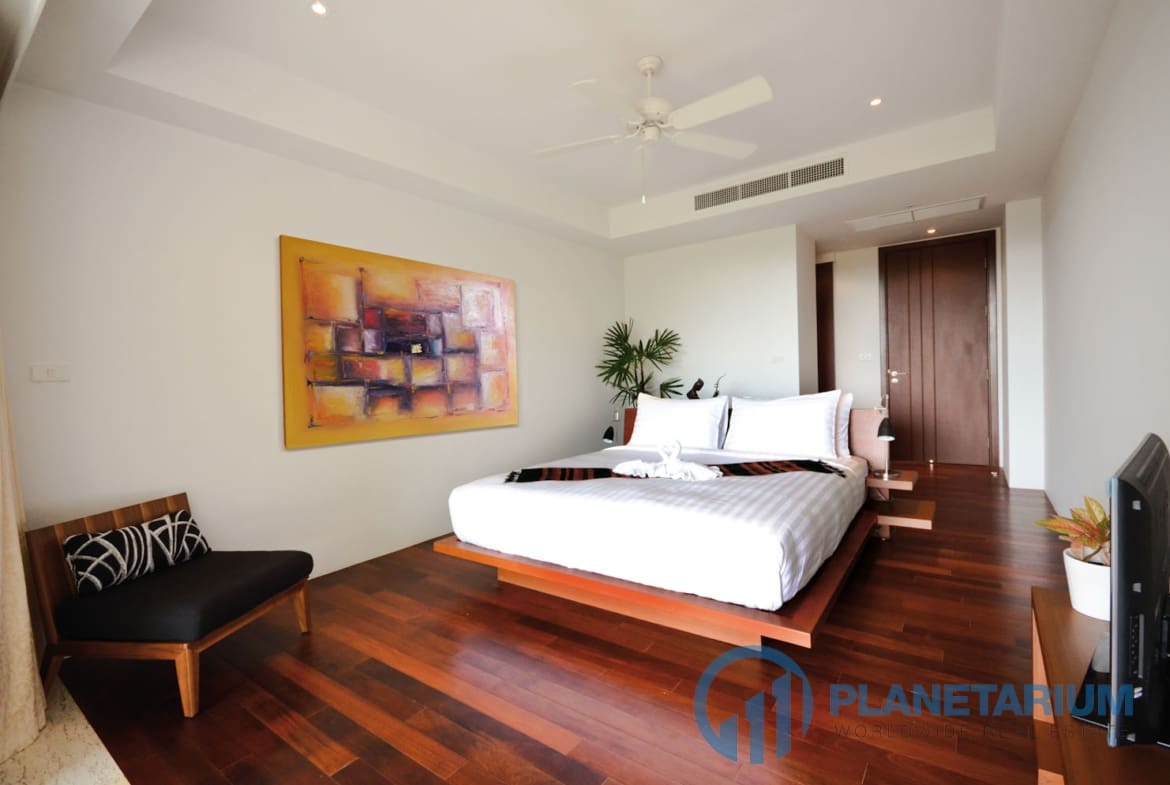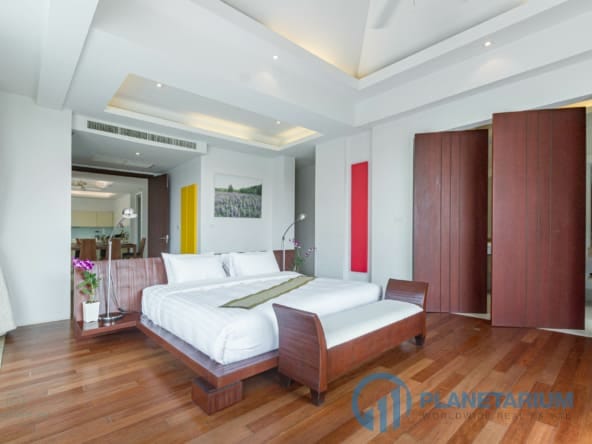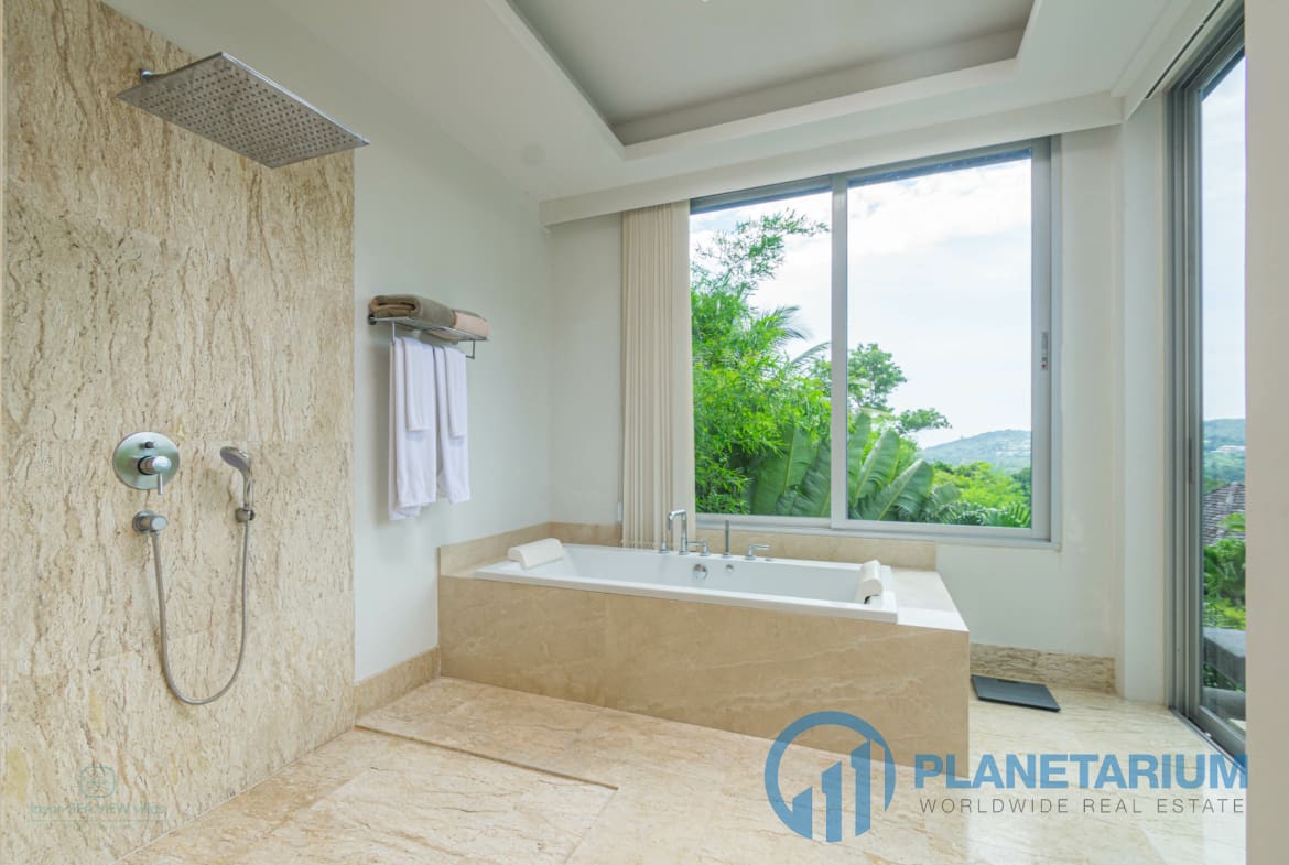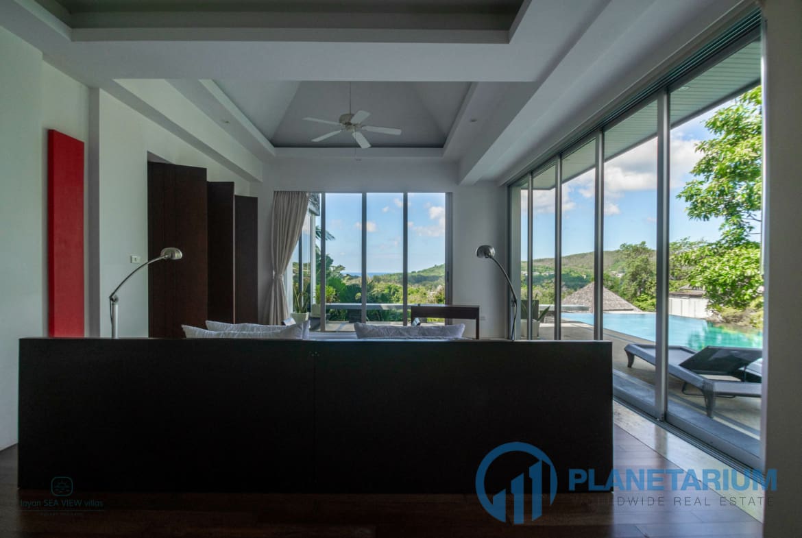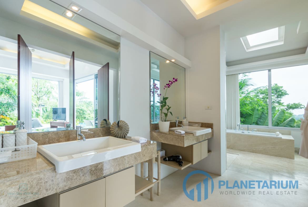 - 🌺 Floor-to-ceiling sliding glass doors in the living room, dining room, and master bedroom open onto a spacious poolside terrace with views of tropical plants, mountains, and the distant Andaman Sea