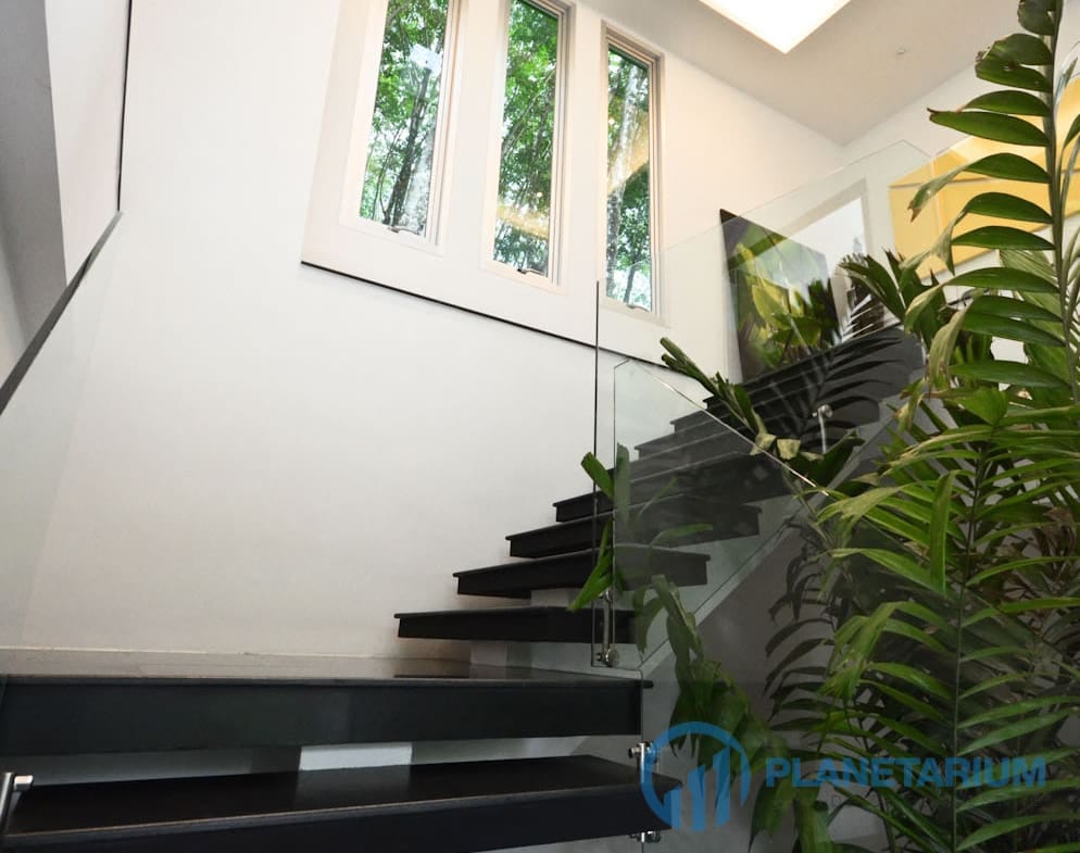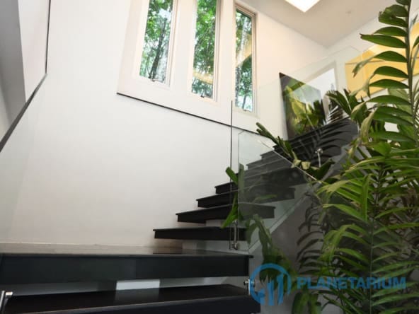 The 2.5-storey villa boasts a spacious, stylish interior with modern furniture. The main entrance is through the ground floor, featuring: