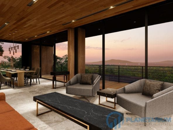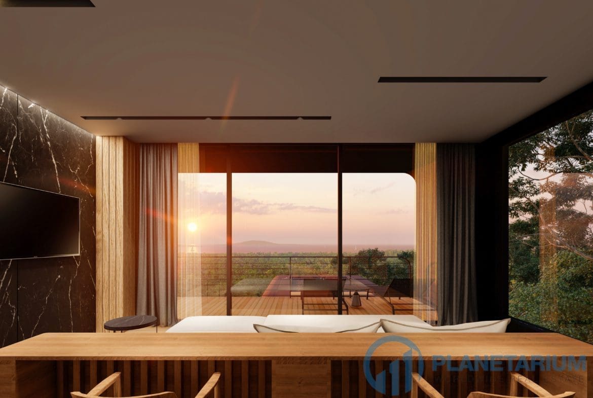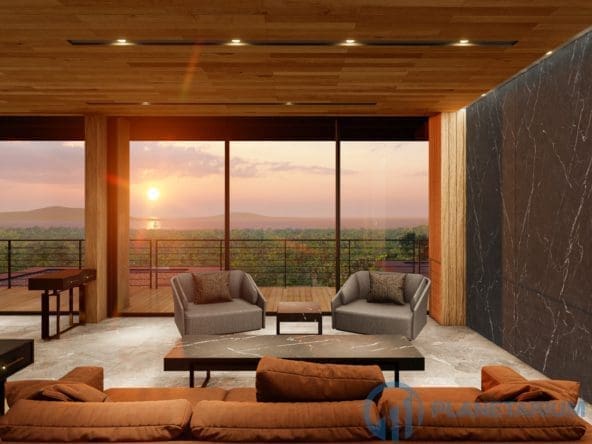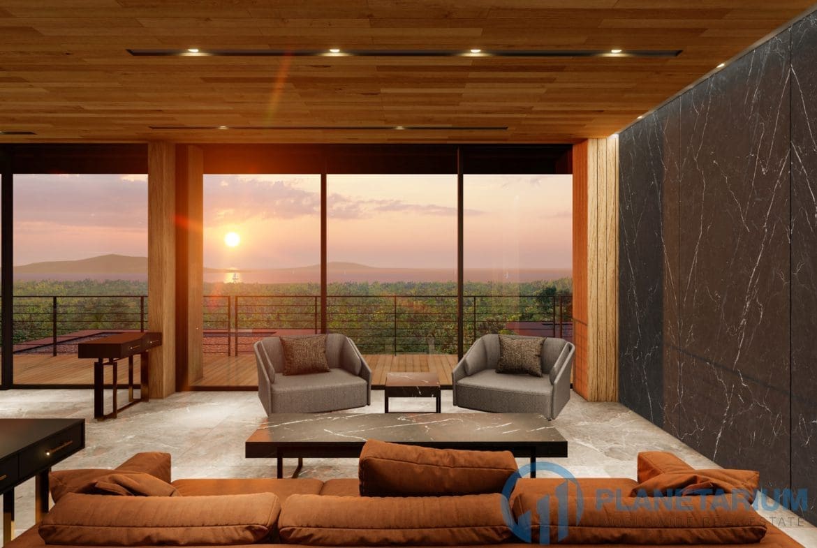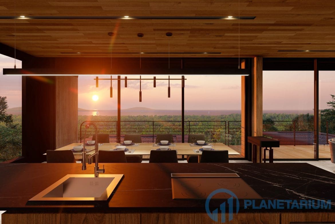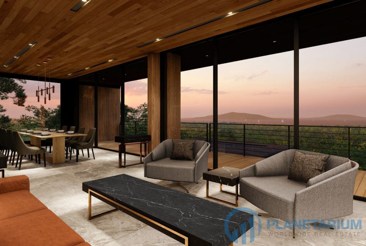 This luxury villa is located on a hilltop, overlooking Chalong Bay. On one side, the property looks out into the waters of the Andaman sea; on the other side, it borders with forest a and mountain. The villas feature a modern contemporary design that complements the green hillside surroundings. It is set in a prime location; adjacent to popular landmarks, supermarkets, and restaurants, also this villa only is 38 kilometers away from the airport This modern contemporary villa sits on 814 square meters of land, blessed with stunning views of the sea and sunset. The villa has three separate pavilions, all looking out to the sparkling sea. Each pavilion features a 3-meter-high ceiling, giving the villa a more sophisticated look while also creating a more airy and relaxing ambiance. At the villa, it is totally tranquil and private