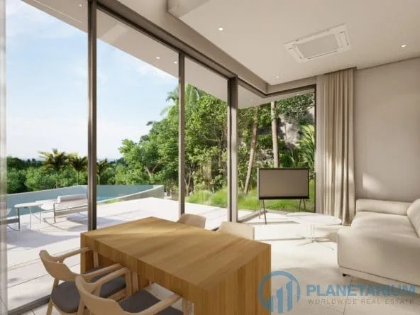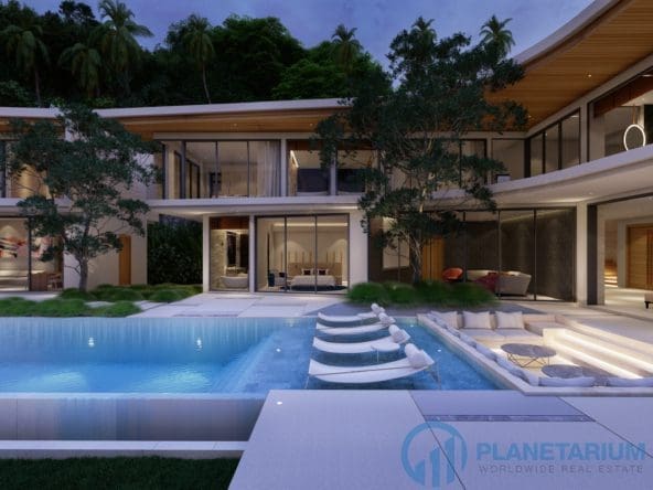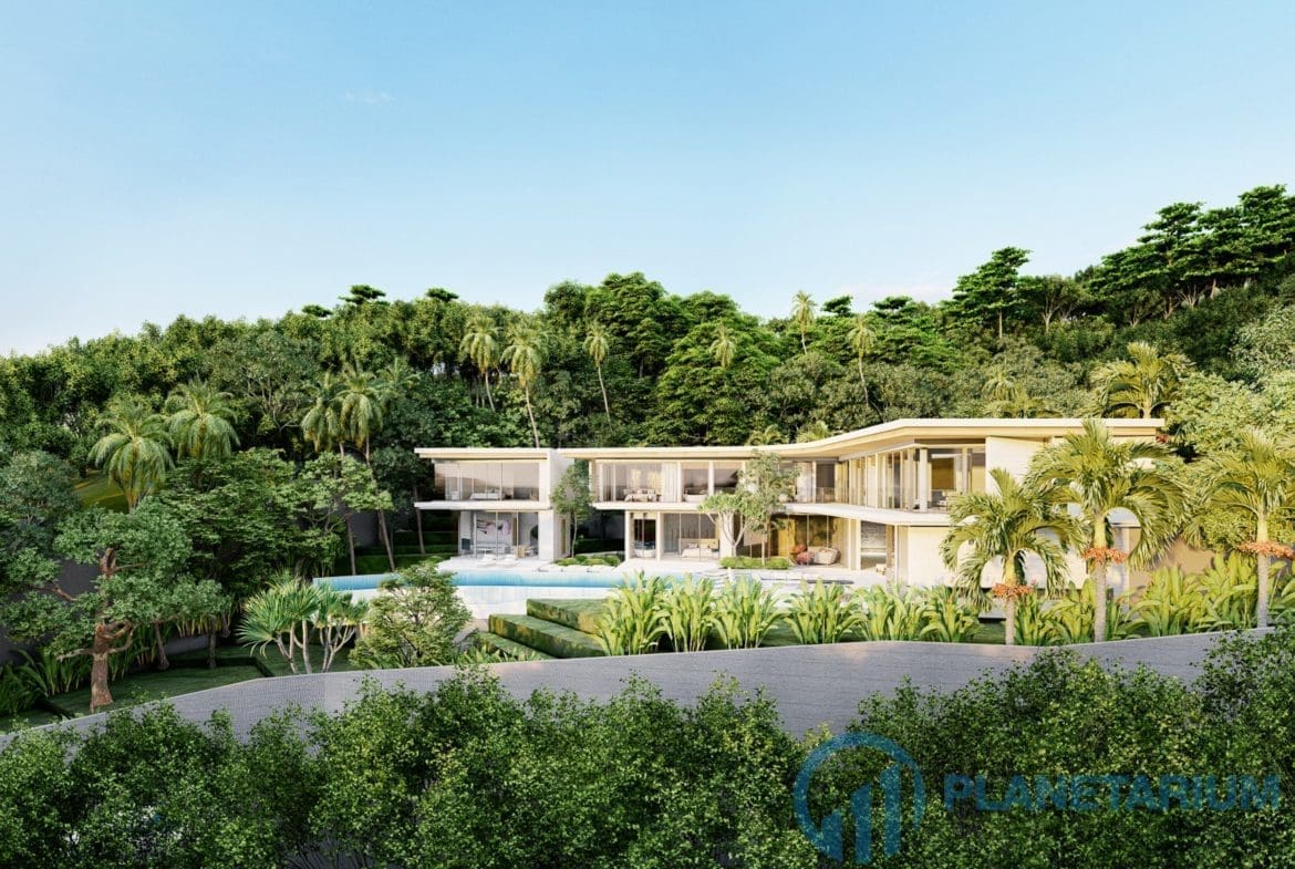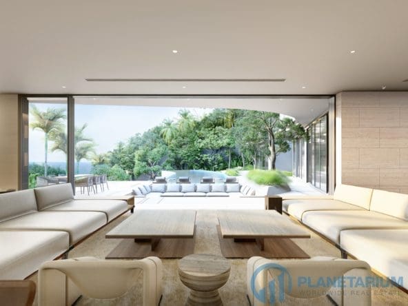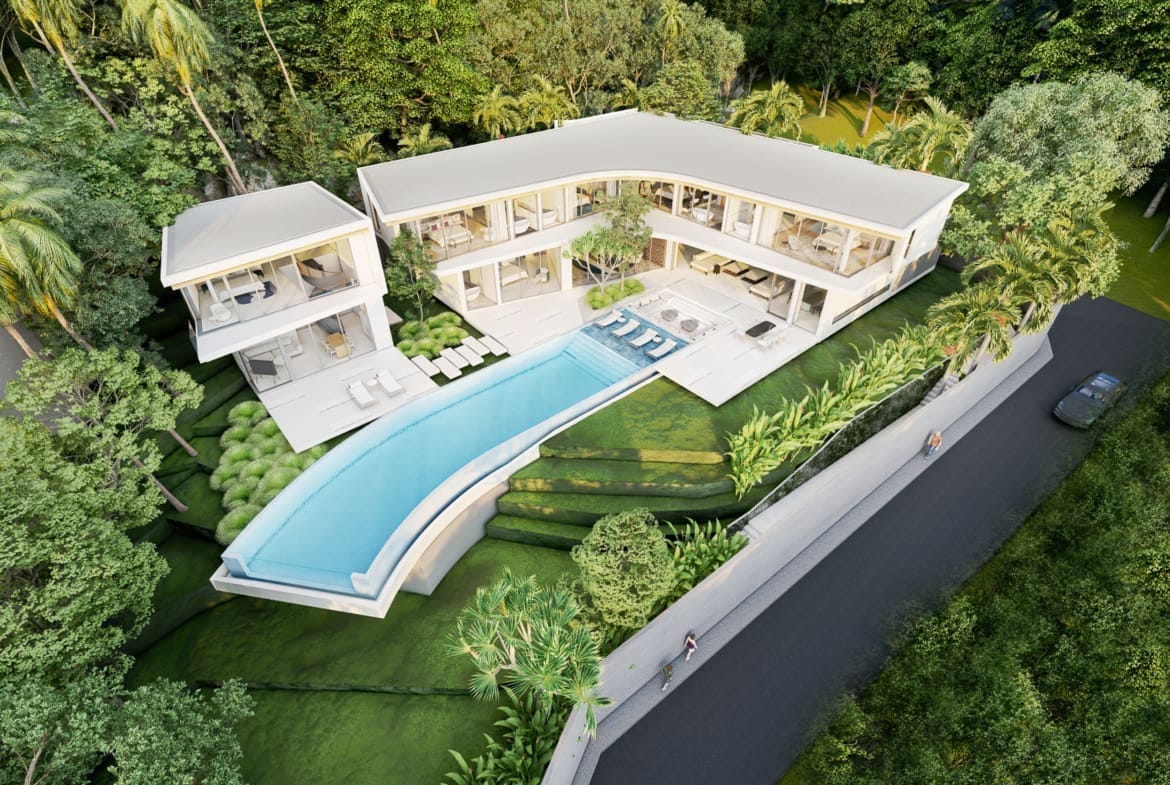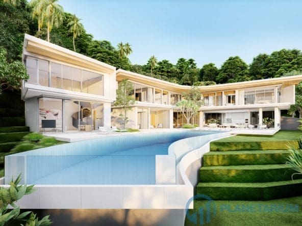 This luxury villa is located on a hilltop, on Phuket’s west coast with sweeping views of Karon beach and the stunning horizon. The villa is only a few minutes from Kata & Karon Beach, the most exciting and lively scene in Phuket for beach life, nightlife, restaurants, and shopping. At the villa, it is totally tranquil and private. The property boasts a mix of Scandinavian and modern luxury styles. The structured yet comfortable interiors are generous with space and natural light flooding, designed to inspire relaxation. The main level consists of a garden, a three-car garage, the dining and living areas, as well as the kitchen. Outside the main level is a swimming pool that overlooks the sea and mountain