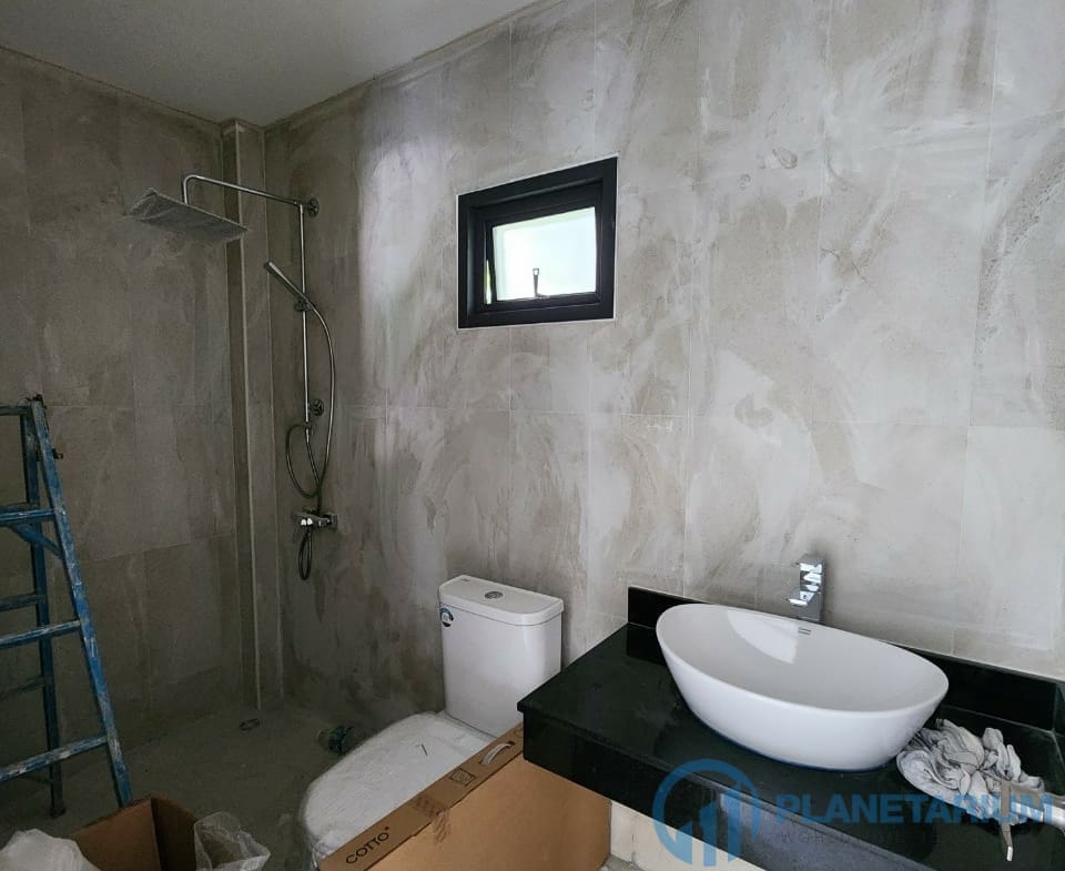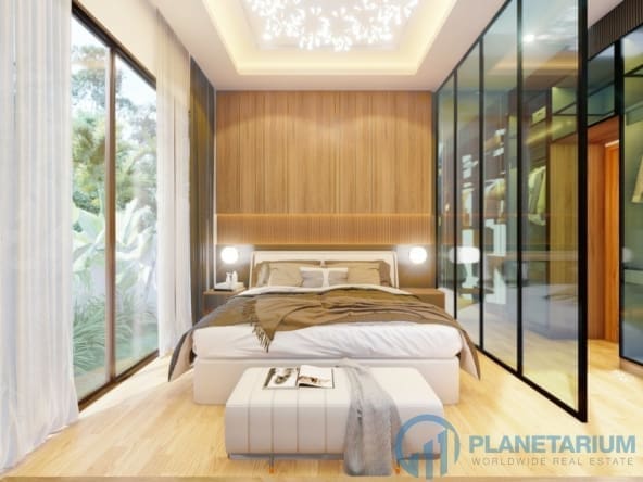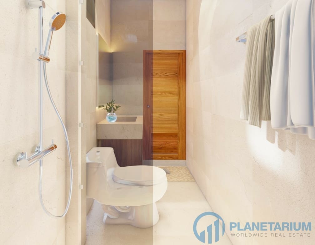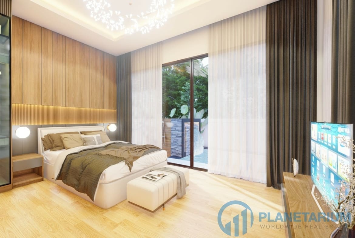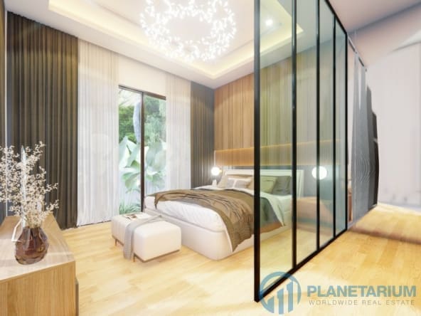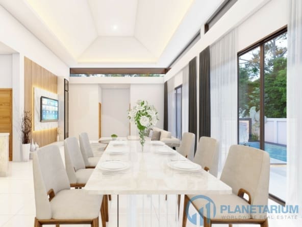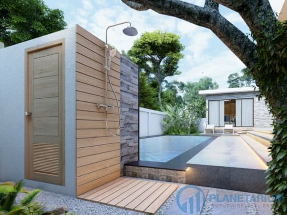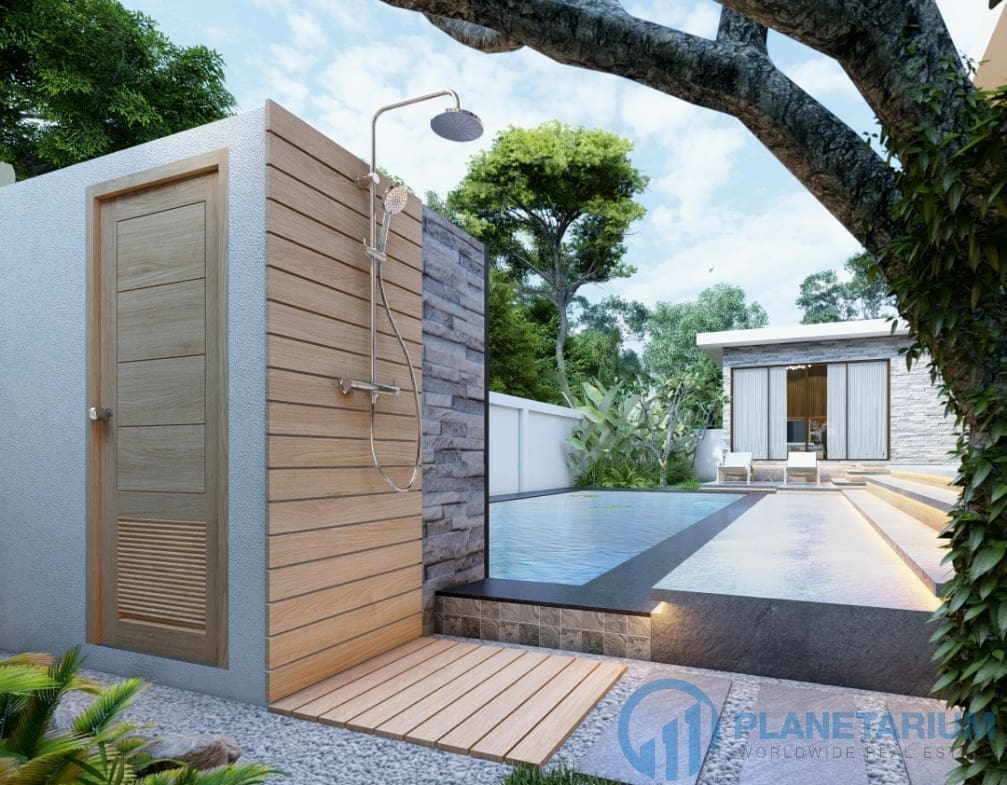 The design combines modernity and Balinese architecture perfectly and beautifully. It features three well-appointed bedrooms, a beautiful open plan living and dining area. and a fully equipped kitchen with a breakfast bar. The master bedroom The 1st guest bedroom, including the living and dining area, faces the poolside terrace which features a split terrace and private pool. For the master room, the bathroom is a separate bathtub and shower.