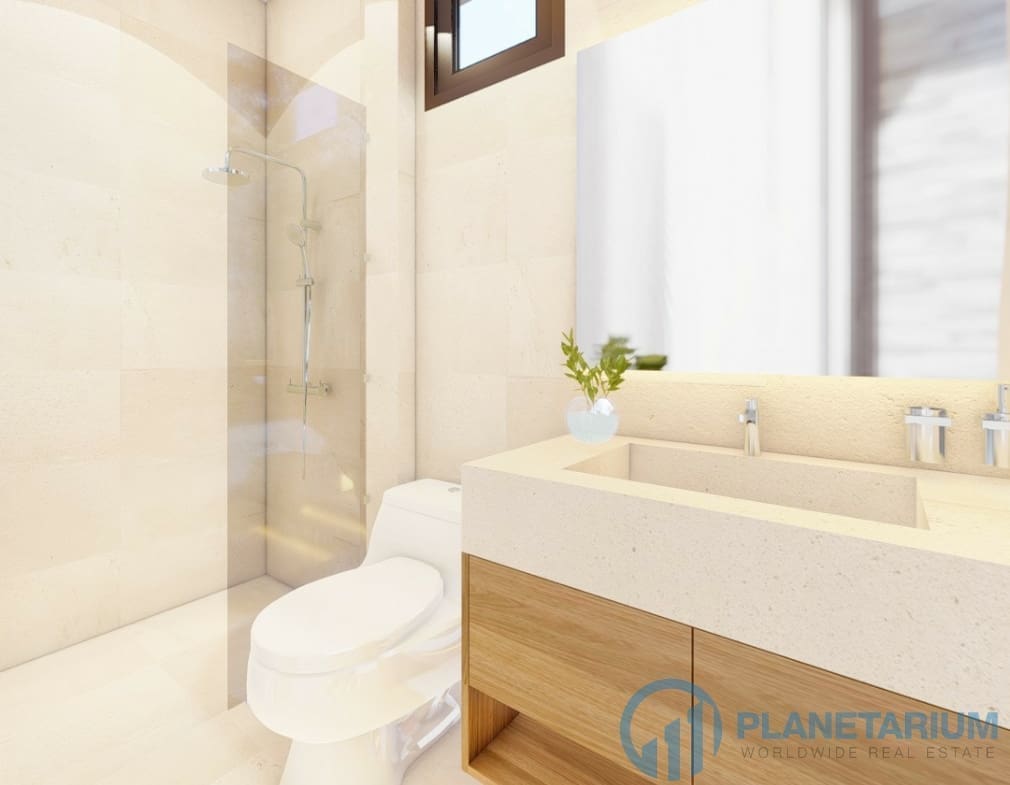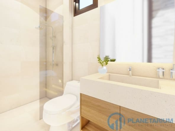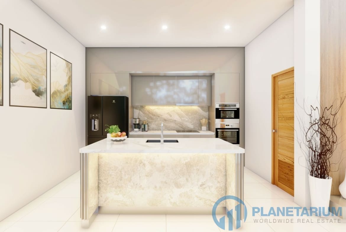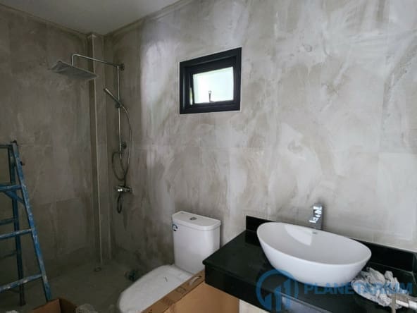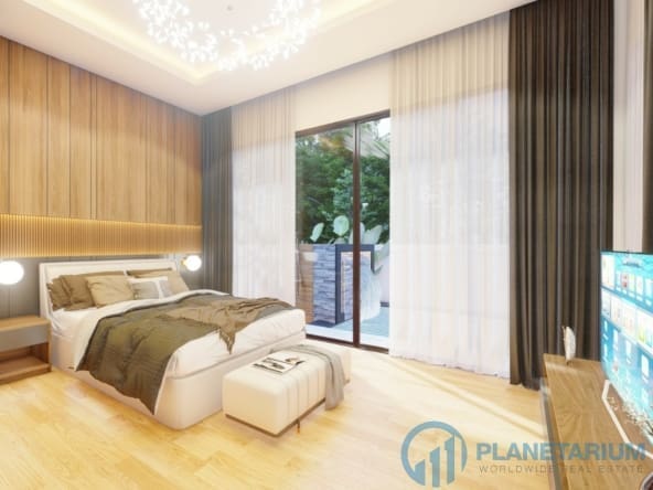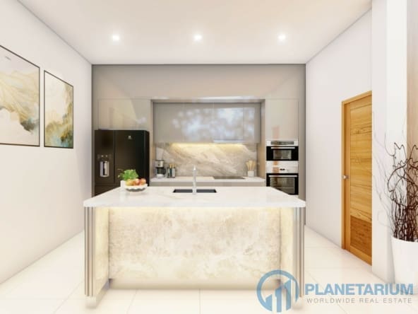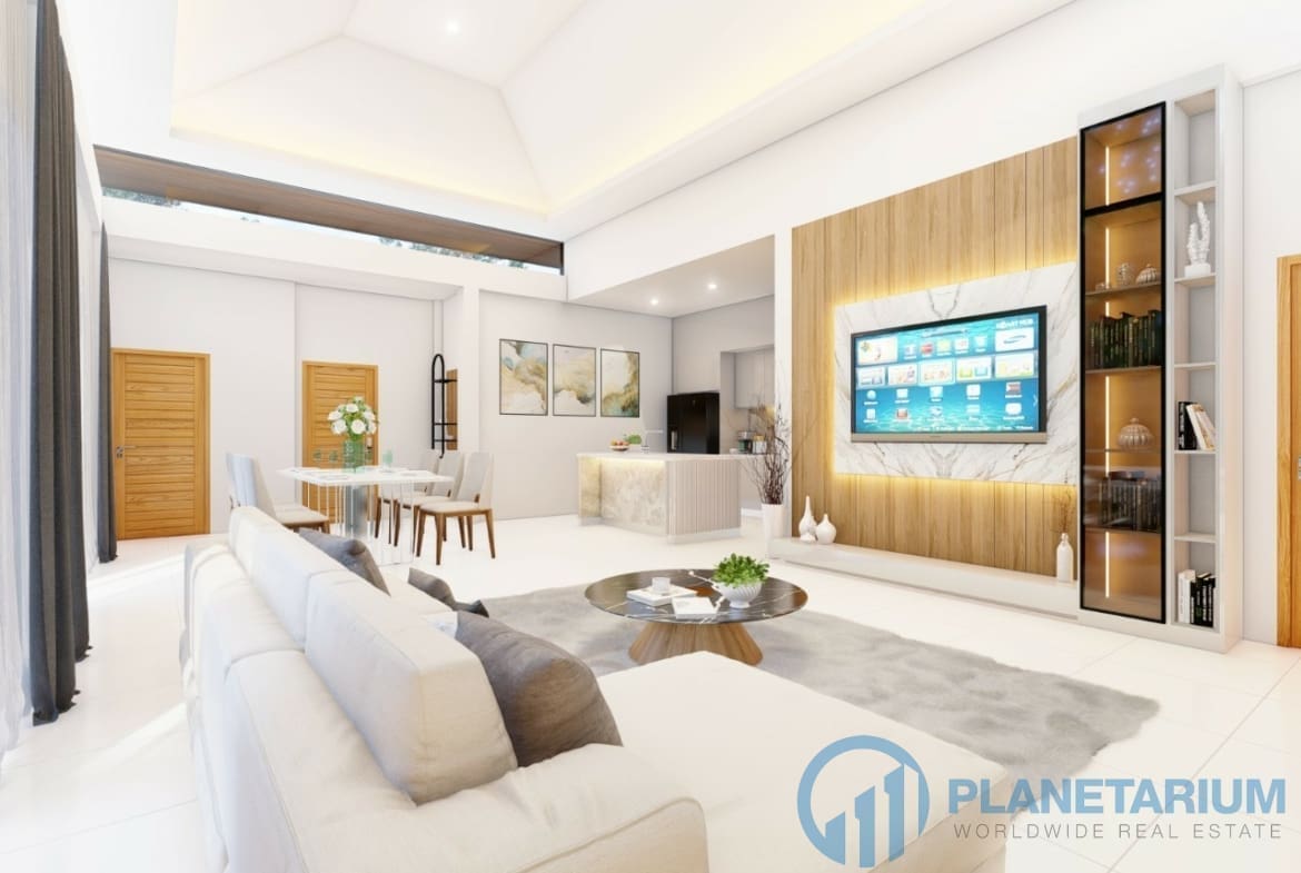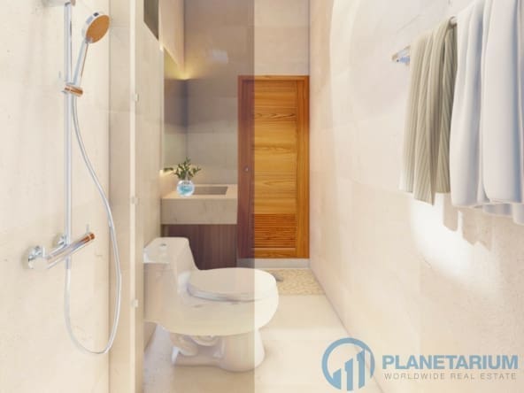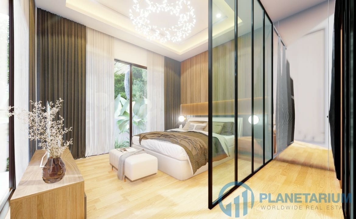 The design combines modernity and Balinese architecture perfectly and beautifully. It features three well-appointed bedrooms, a beautiful open plan living and dining area. and a fully equipped kitchen with a breakfast bar. The master bedroom The 1st guest bedroom, including the living and dining area, faces the poolside terrace which features a split terrace and private pool. For the master room, the bathroom is a separate bathtub and shower.