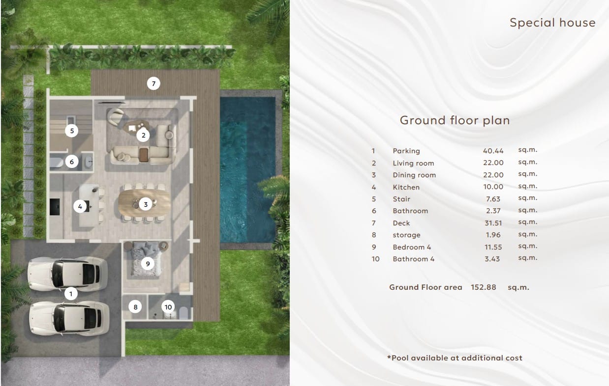 The design philosophy is simple — space for living, not excess. Every home is thoughtfully planned to provide complete privacy, along with a private swimming pool, terrace, garden, and parking for two cars.