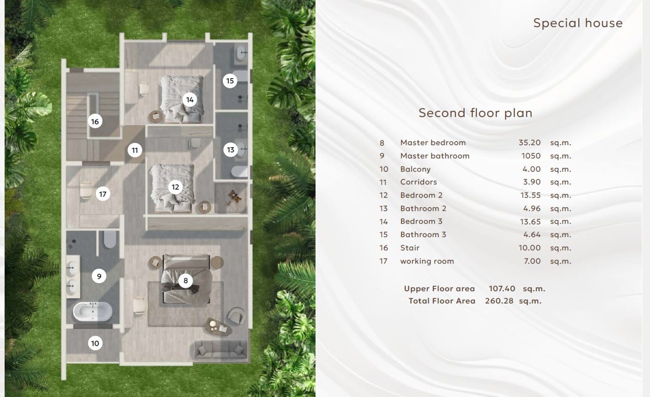 Experience modern tropical living in beautifully designed minimalist homes, each offering approximately 230 m² of interior space. These villas feature large windows, light-toned facades, and natural materials, creating a bright and calming living environment that blends seamlessly with nature.