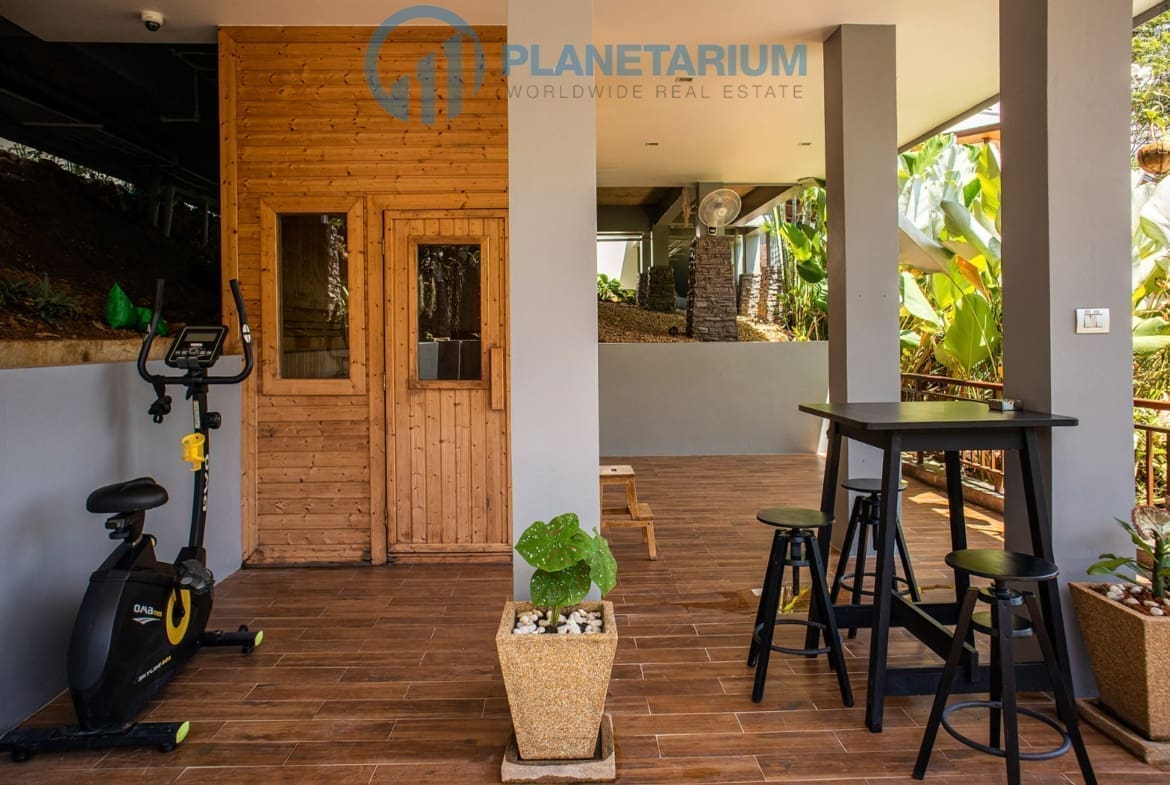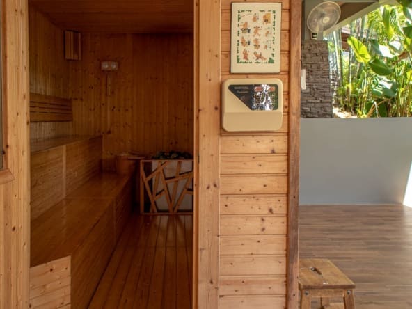 There is a 15m pool with jacuzzi, sun beds, umbrellas, bean bags and nearby separate bathroom and outdoor shower. Near the pool is a big outdoor seating/dining area with a canopy and BBQ. Down some stairs is a large sauna room, pool table, and exercise bike. There is plenty of parking space.