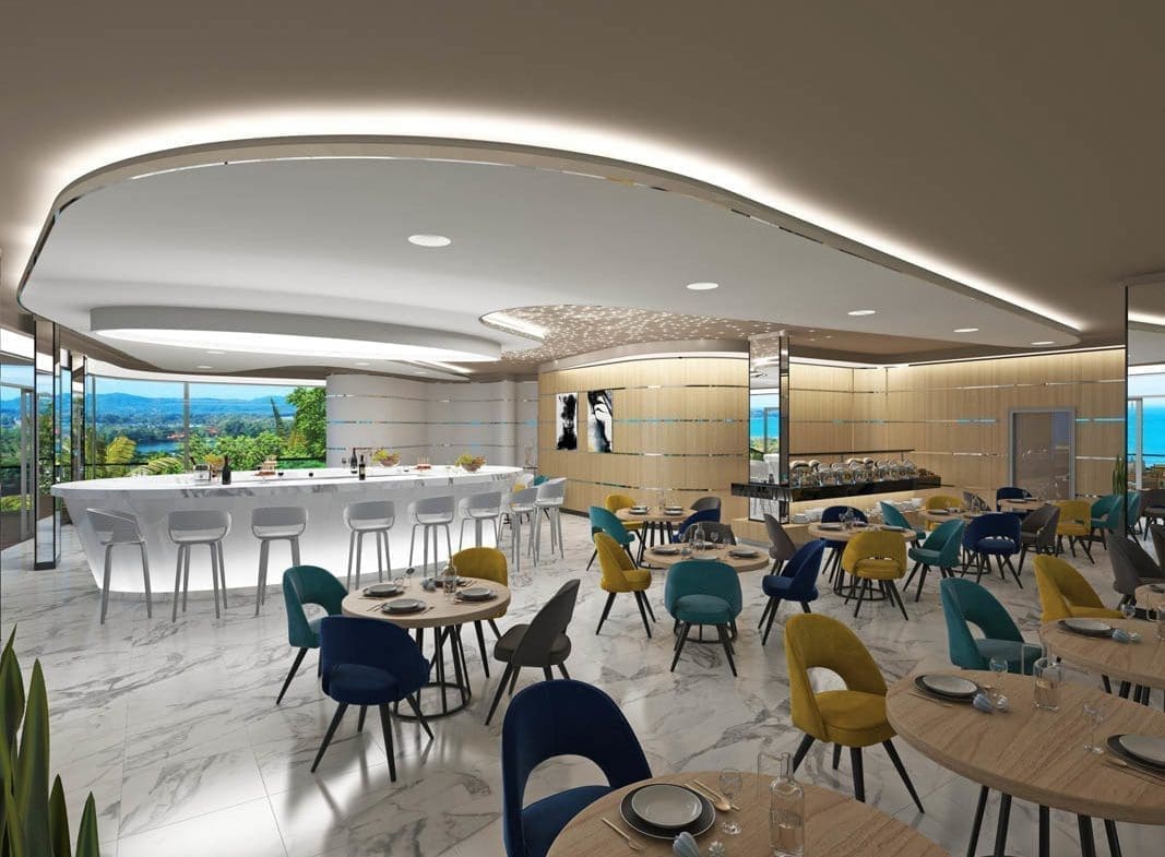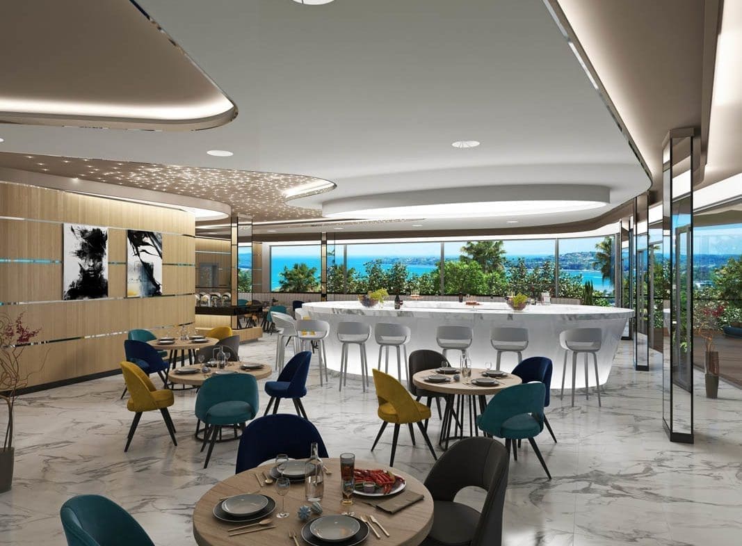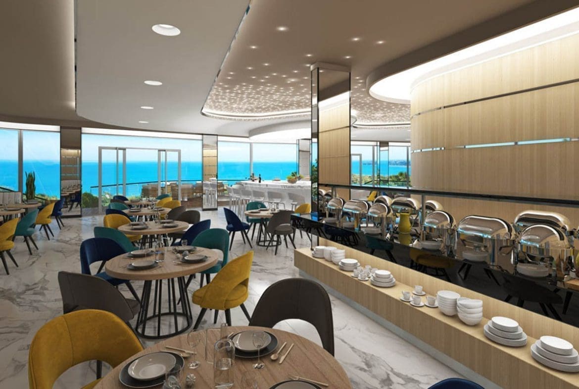 Все квартиры в 5-этажном здании, имеют вид на море и окружающую зелень. Само здание имеет уникальную форму – в виде круизного лайнера.