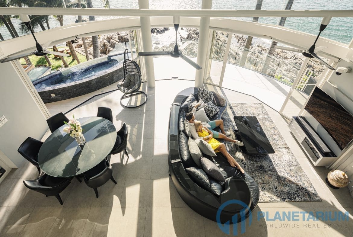 Сердцем дома является просторная гостиная, которая плавно перетекает из внутренних помещений в наружные. Открытая гостиная зона предназначена для развлечений: здесь есть бассейн-инфинити, джакузи под открытым небом и много места для отдыха и обедов. Если вы устраиваете большое собрание или просто отдыхаете с семьей и друзьями, это идеальное место для этого.