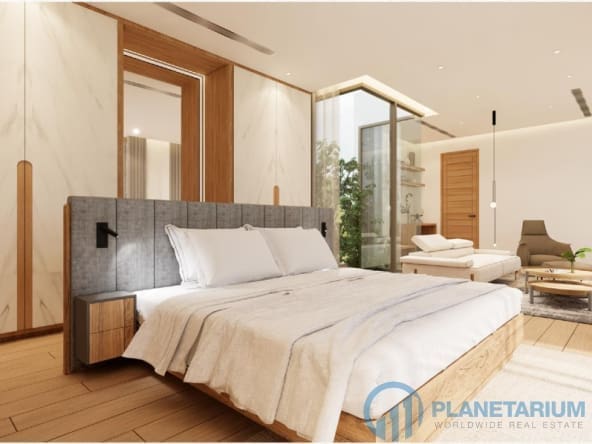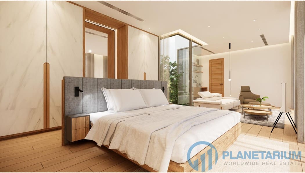 Большие стеклянные окна от пола до потолка наполняют естественным светом каждую комнату и спальню. В каждой спальне имеется собственная ванная комната, а из некоторых есть прямой выход к бассейну, на балкон или террасу, что делает их идеальным местом для того, чтобы греться на солнце и наслаждаться освежающим бризом. Главная спальня поднимает роскошь на новый уровень благодаря своей просторности, включая отдельную гостиную зону и ванную комнату с отдельной ванной и душем.